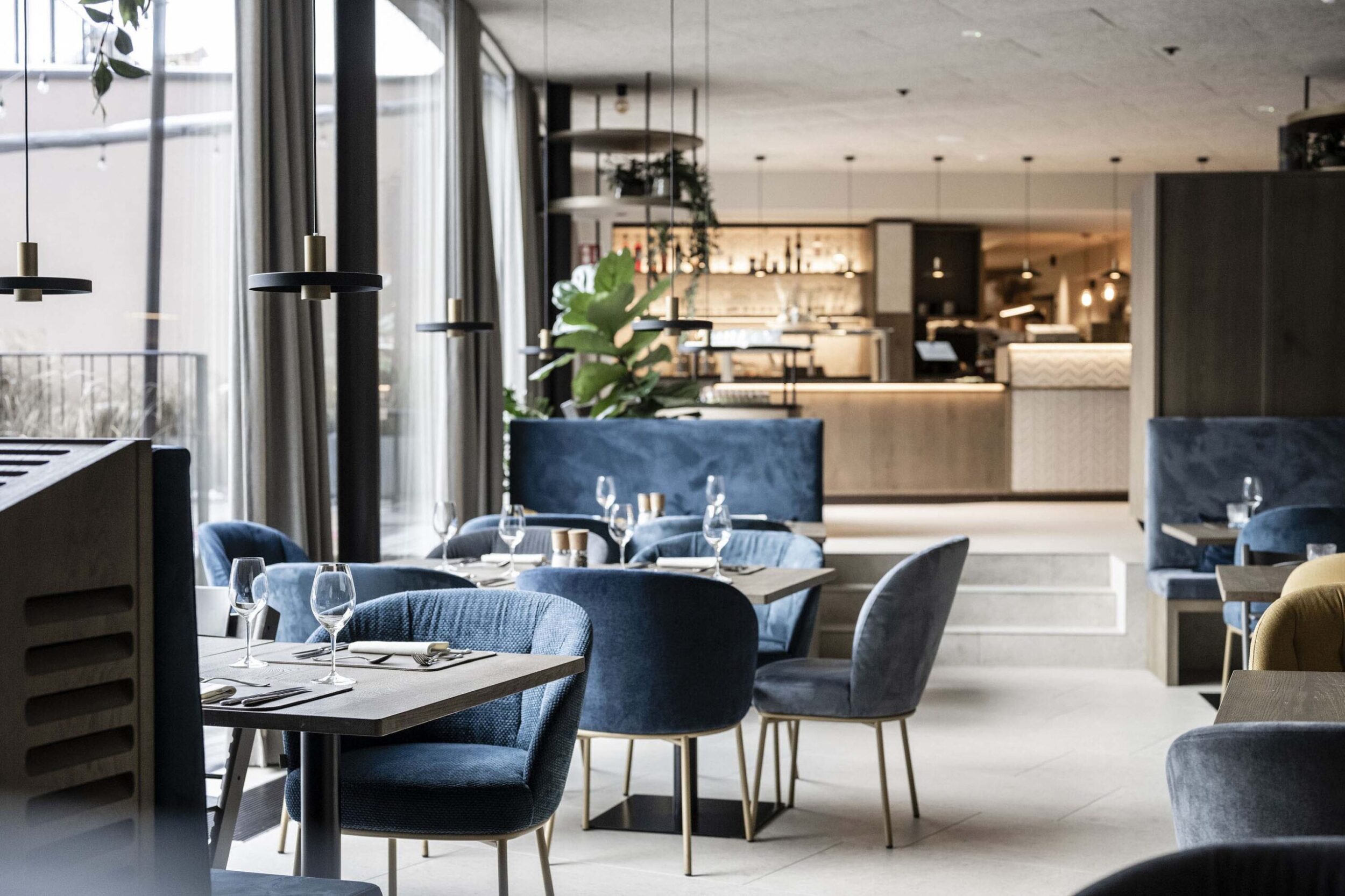As flooring, Eterna Arena was chosen not only for its natural stone effect but also because it incorporates the CleanOut Antibacterial Protection treatment, the Ragno antibacterial technology that guarantees hygiene and health through the addition of silver ions during the production process. The tables zone is defined by the concrete effect with a slightly uneven, matt texture of Stratford porcelain stoneware in a reassuring Blue color (60×60 cm).