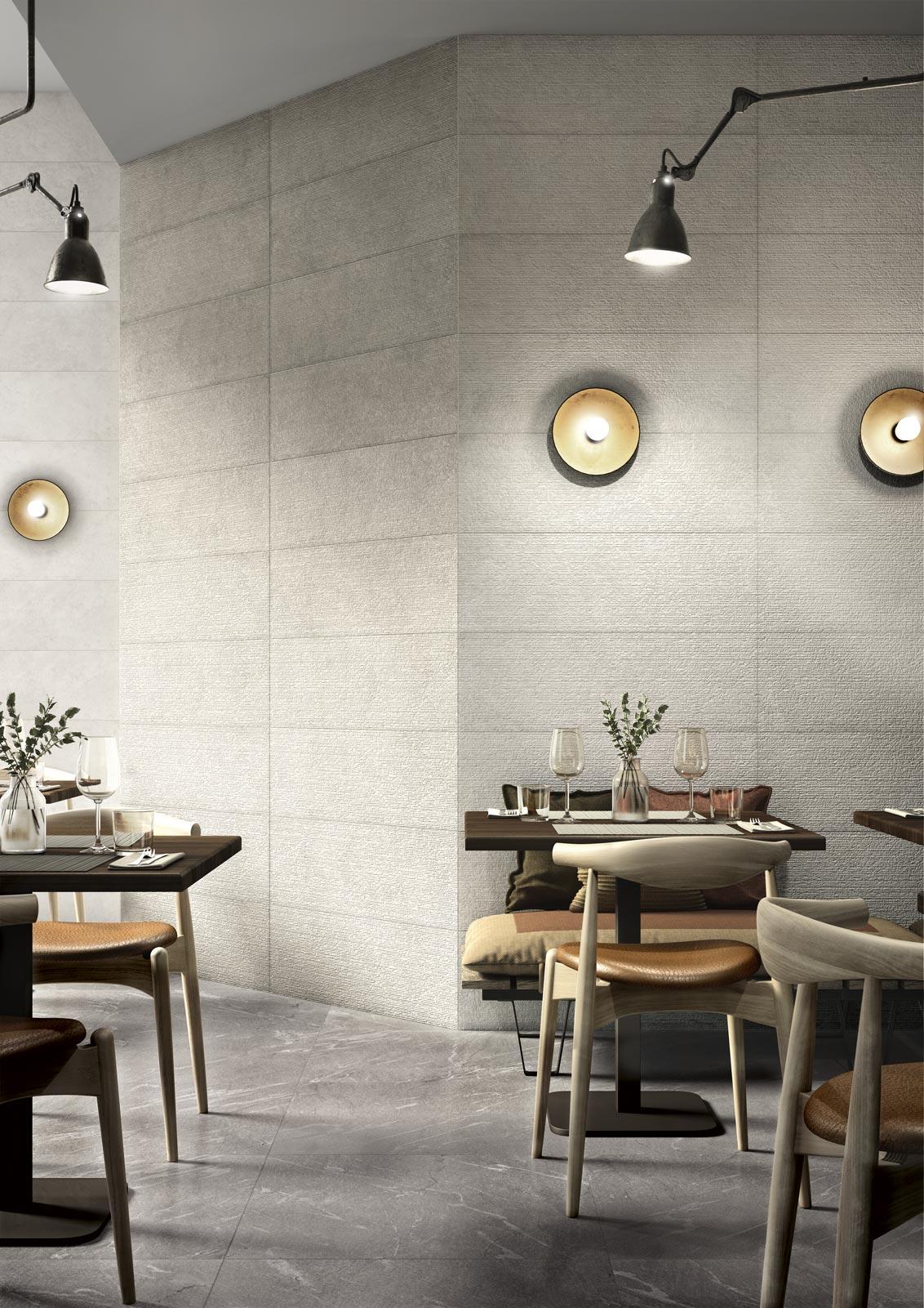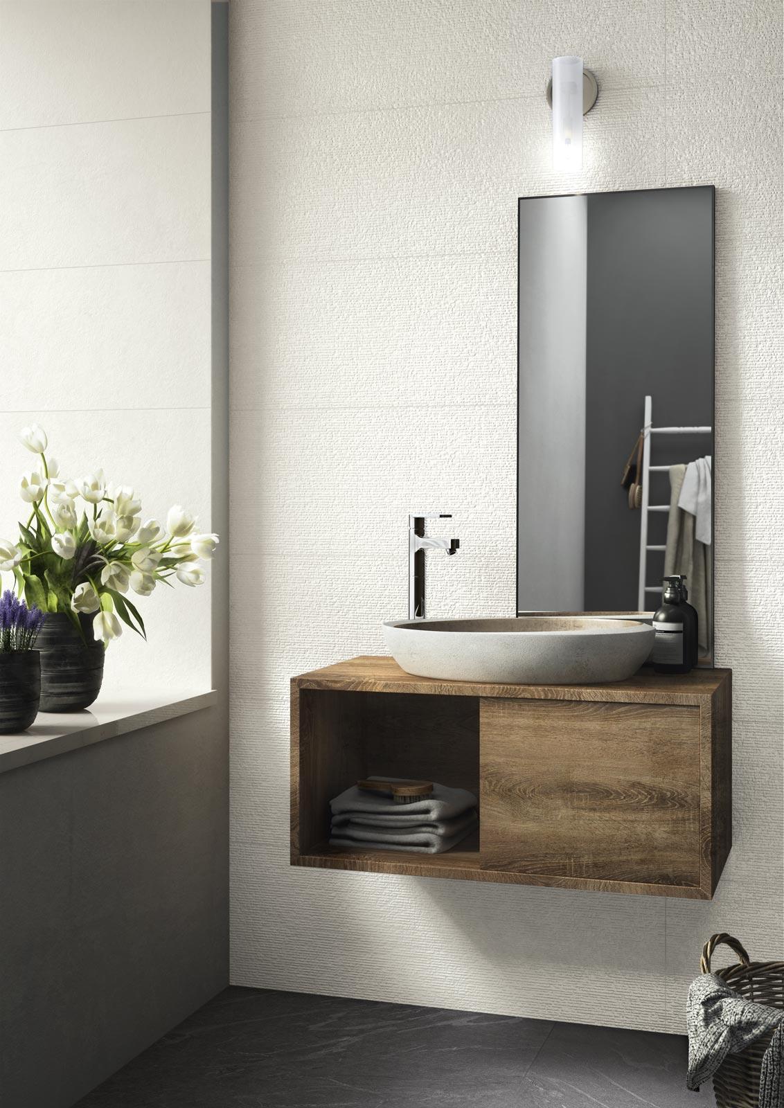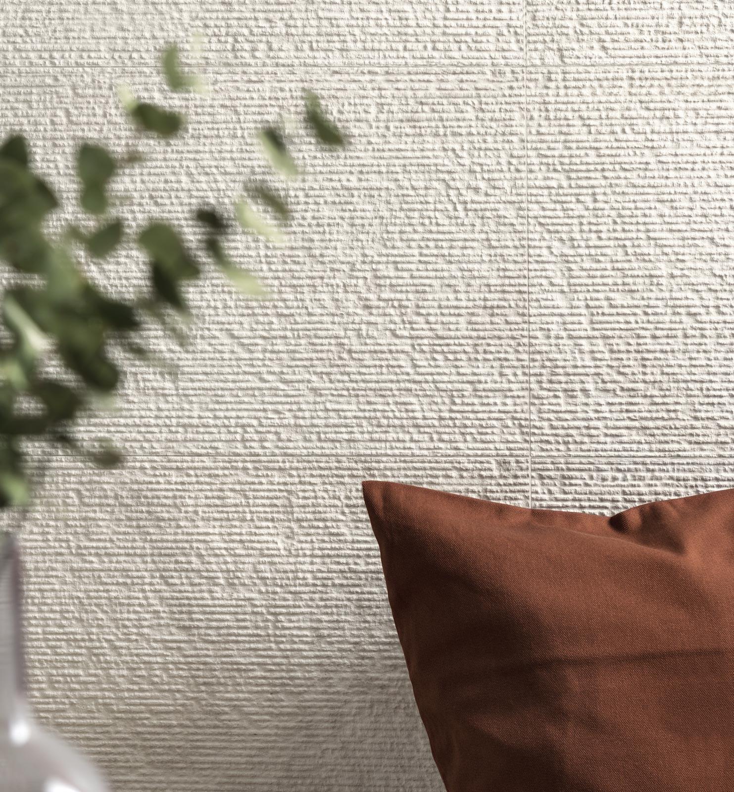 Suitable only for use on walls, the 32.5 x 97.7 cm tiles are available in four subtle, natural colours with luminosity gradually varying from white to grey by way of ivory and greige, avoiding all saturated hues or touches of brighter colour.