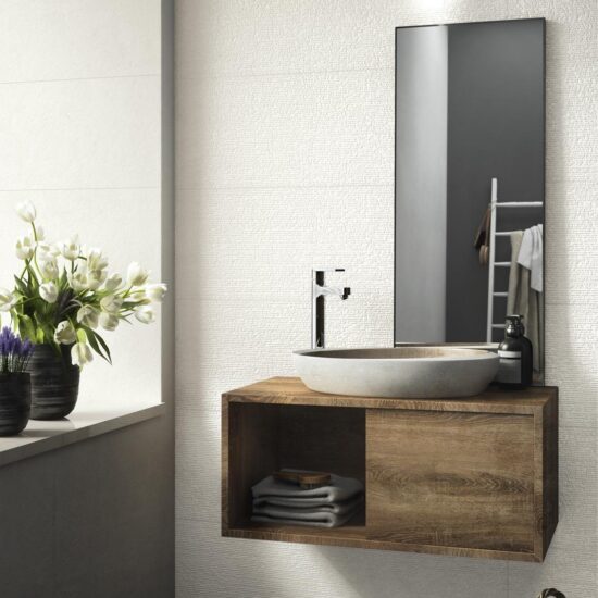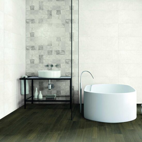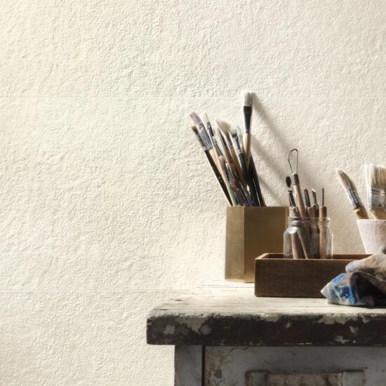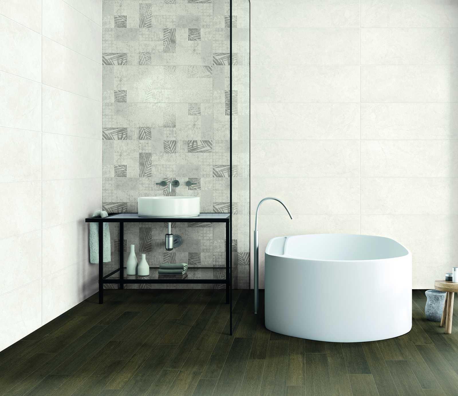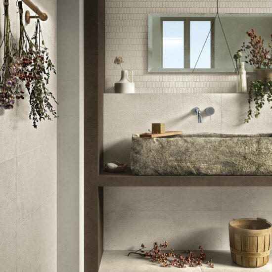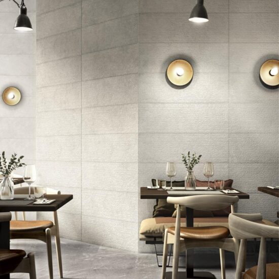 Suitable only for use on walls, the 32.5 x 97.7 cm tiles are available in four subtle, natural colours with luminosity gradually varying from white to grey by way of ivory and greige, avoiding all saturated hues or touches of brighter colour.