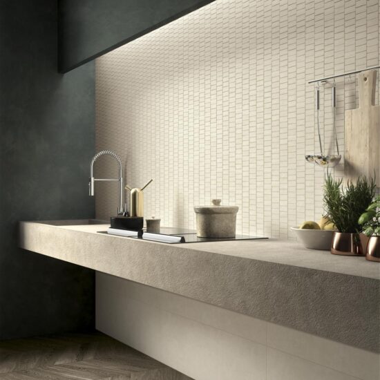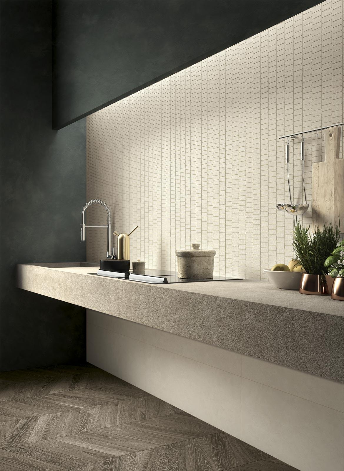 At the same time, the large size allows the construction of a seamless surface on the wall, the joints virtually invisible thanks to the rectified edges and the vibrant, visually communicative, profoundly tactile surface of every single tile.