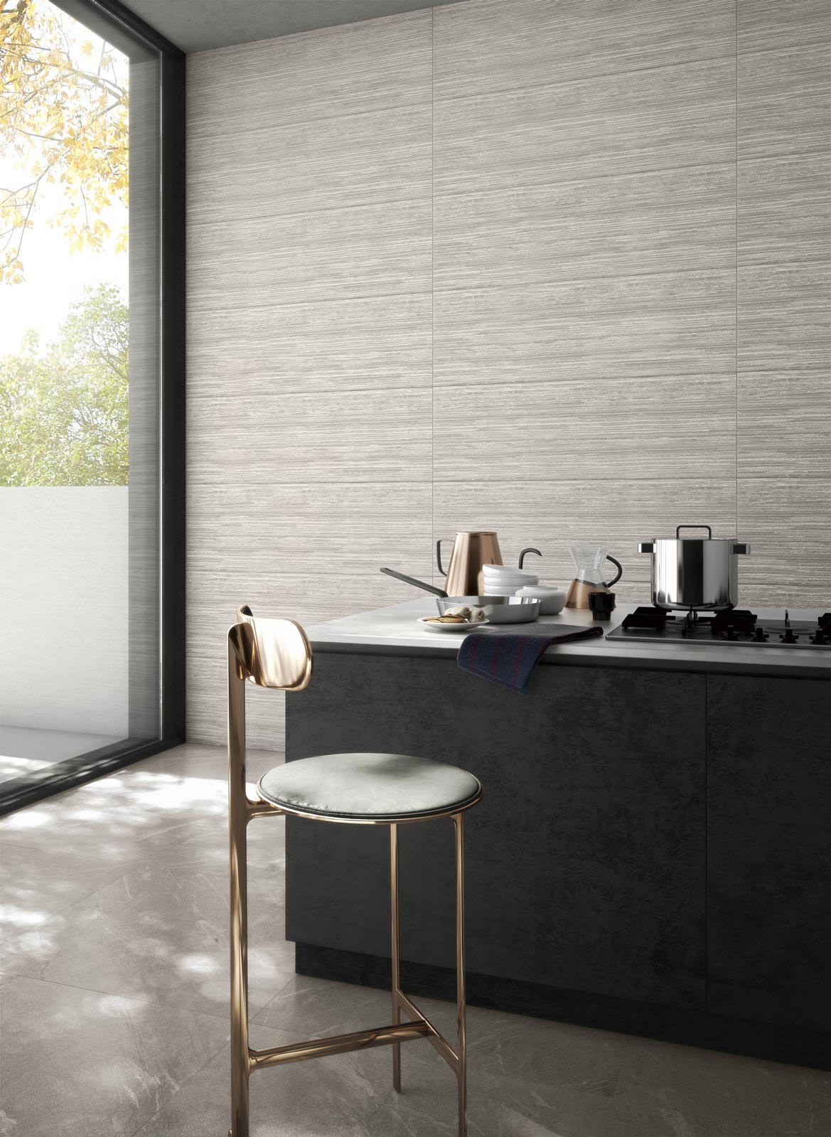 By modulating the surface texture of a single size of rectified slimline ceramic tiles – 40×120 cm, only broken down into square modules of 40×40 cm for the mosaics – it makes the sense of touch, with its direct line to our memories, the key factor in the interpretation of matter and how it speaks to us.