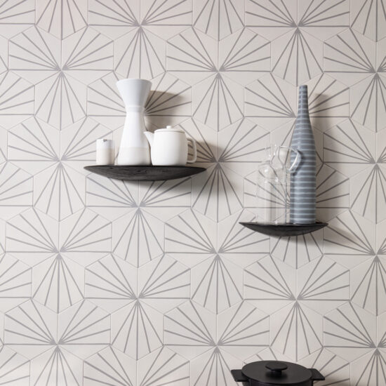 The colour range, consisting of 8 different shades, is fresh and balanced between monochrome hues of blue, green and red juxtaposed with neutral tones of grey and beige; the graphic designs of the hexagon size and the botanical and oriental-inspired patterns with foliage, 3D structures and mosaics immerse you in an exclusive living atmosphere.