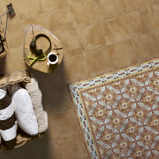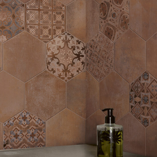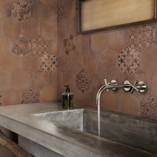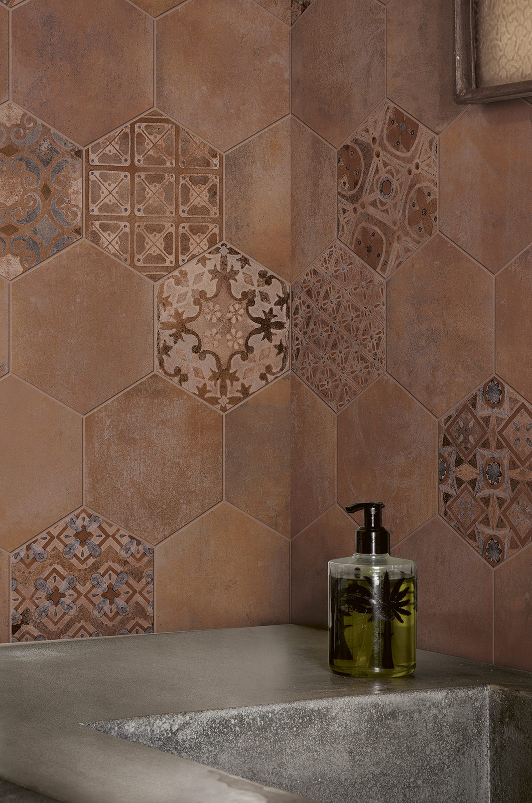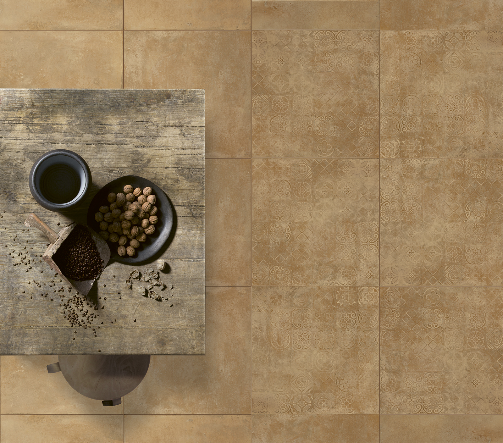What’s more, Epoca also comprises a series of hexagonal “Cementine” (cement tile) decors, two size 60×60 cm decors with geometrical motifs and a “Tappeto” decor.
