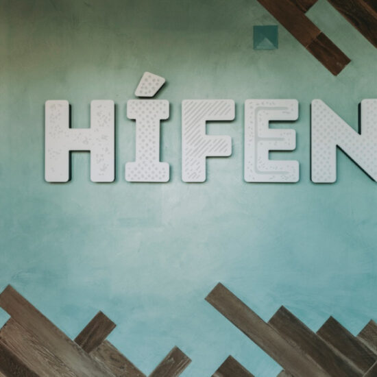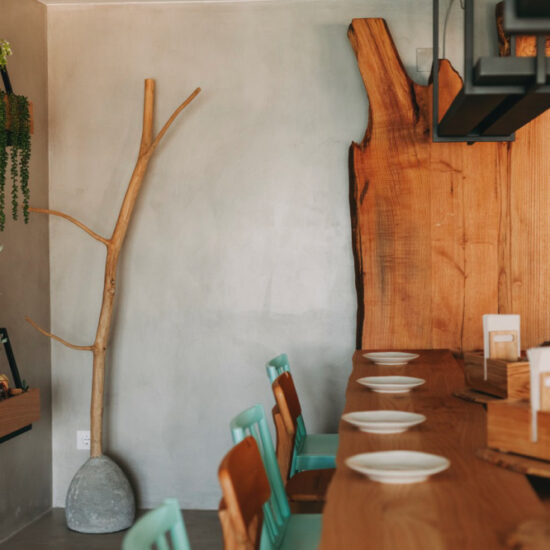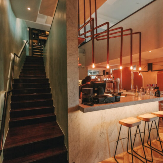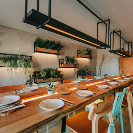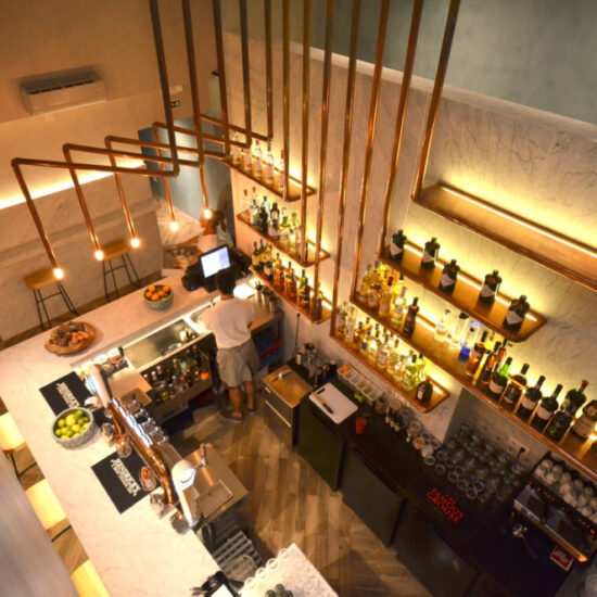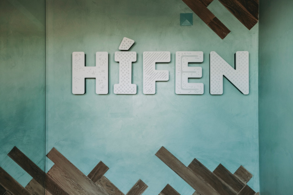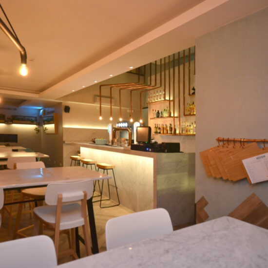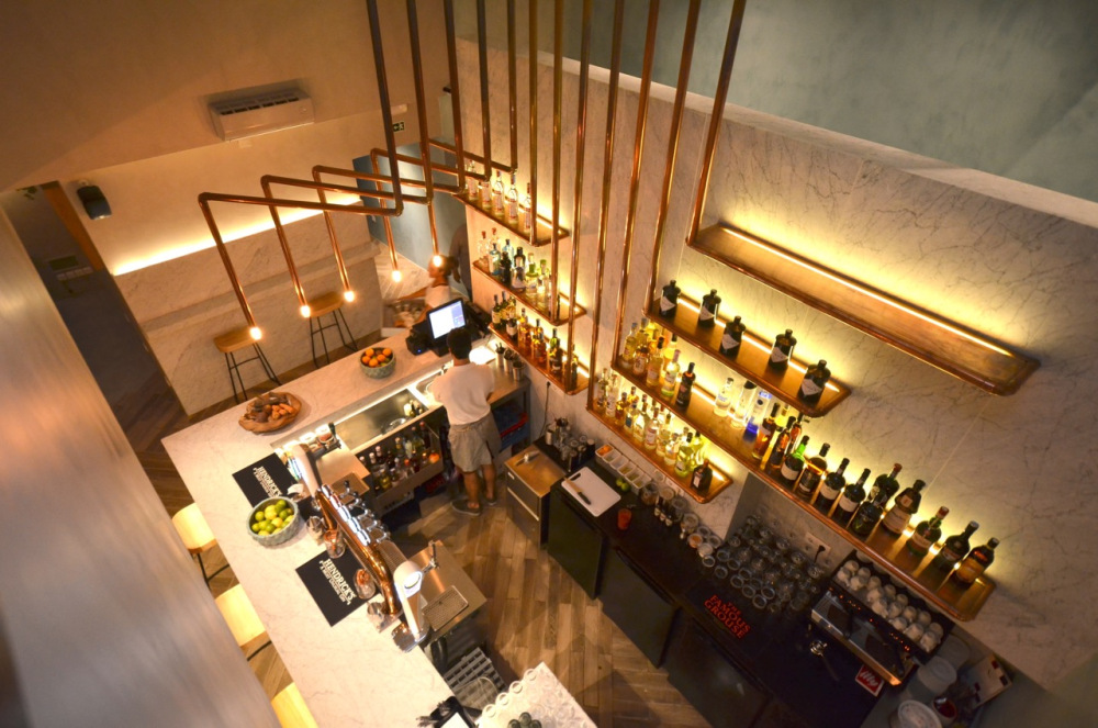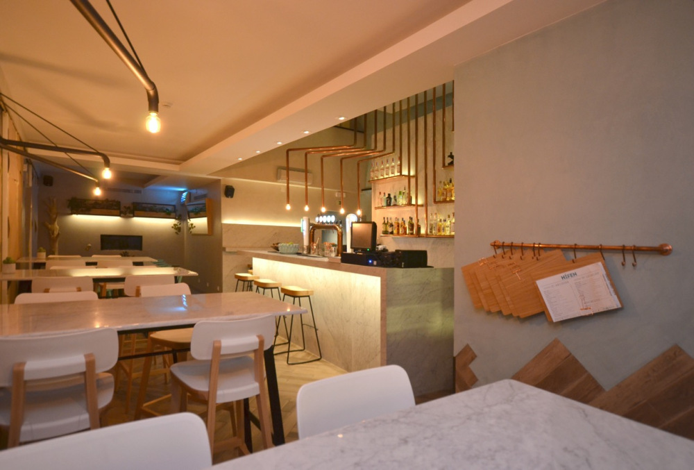 As the name suggests, Hifen's interior design combines different styles: its basic inspiration comes from industrial interiors (noticeable in the metal design features used as the lighting system), but it acquires warmth from the wood-effect stoneware and the predominance of other furnishings in honey-coloured wood, contrasting with the whiteness of the large stone counter.