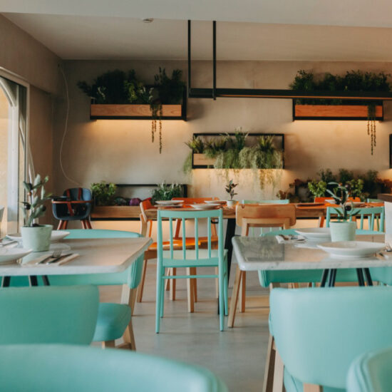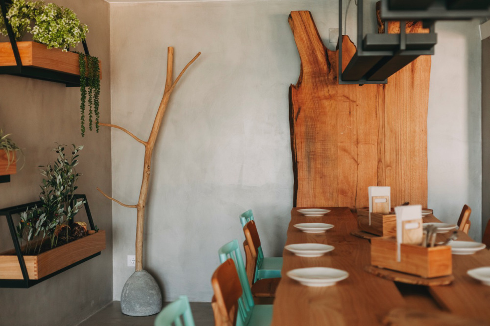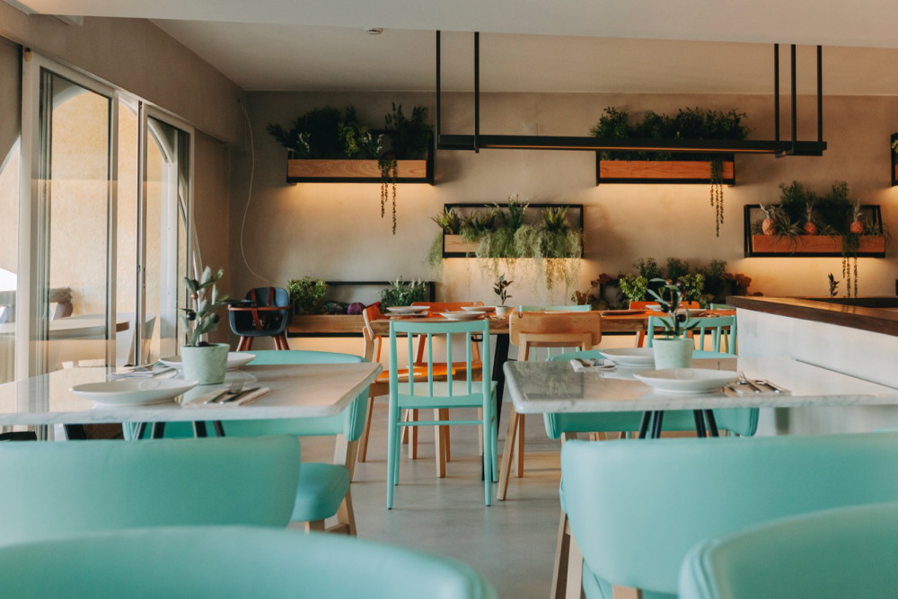 Wood-effect stoneware and aquamarine walls for a casual venue in the Lisbon region