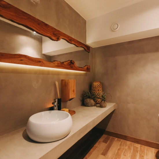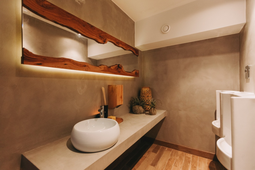 The noise of the waves is audible from inside the restaurant: the sea is ever-present with its fragrance and its aquamarine colour, used for the micro-resin finish of the walls and as dominant colour for the seats. And, almost like the waves breaking on the sand, the cool aquamarine encounters the warmth of the wood-effect stoneware planks of the Woodcraft collection by Ragno, intentionally installed in an irregular pattern: the result is a stylistic embrace that effectively evokes the fusion of two natural elements.