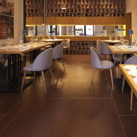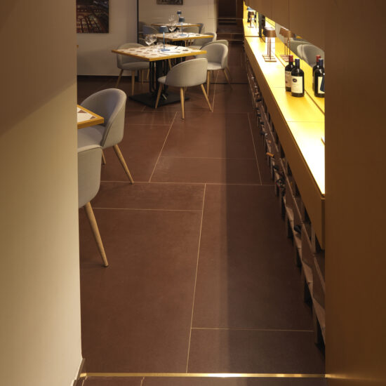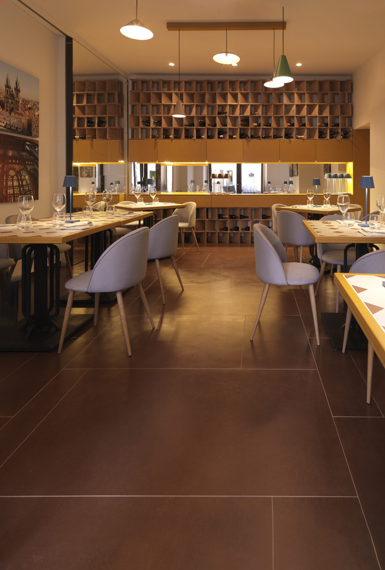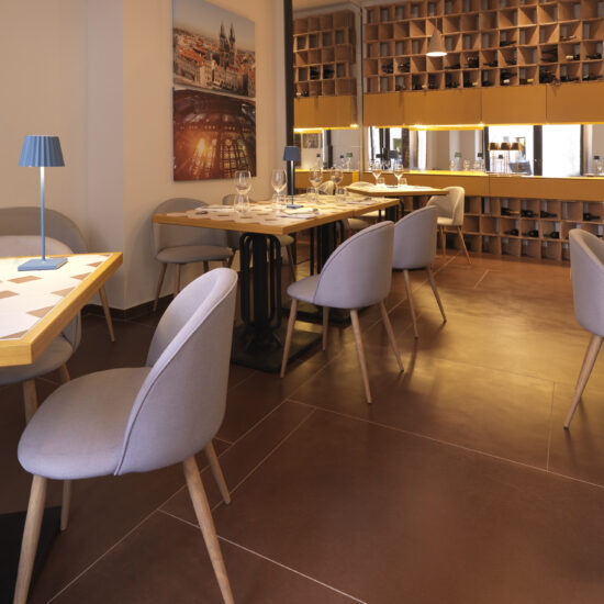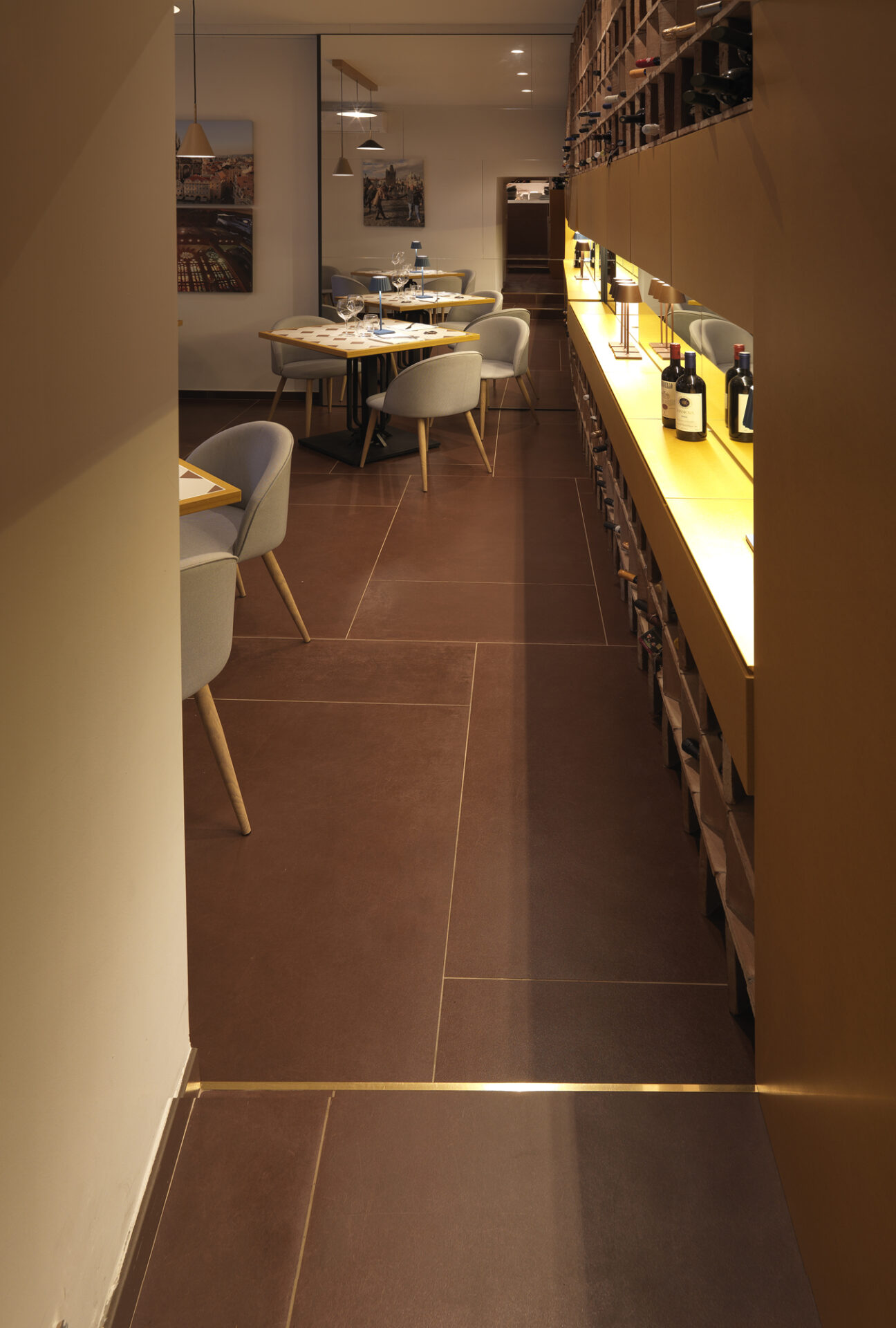 The material theme of the floor is linked to the service wall: here the wines are displayed on an open terracotta bottle rack that characterises the space with sun screen-effect slats at different angles. The Patina porcelain stoneware floor tiles in the Marsala colour and the vertical terracotta-coloured backgrounds create an informal conversation, just like that of the diners in the restaurant sitting on the retro grey fabric armchairs.