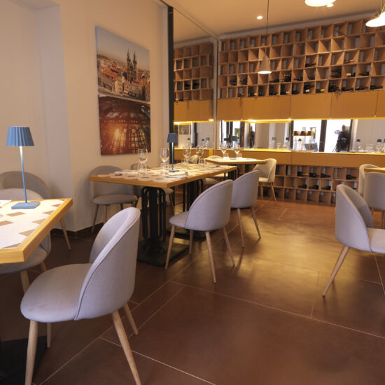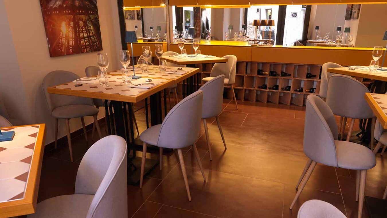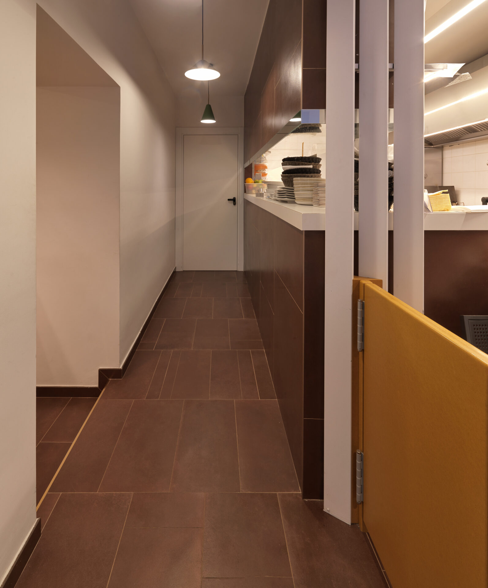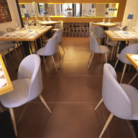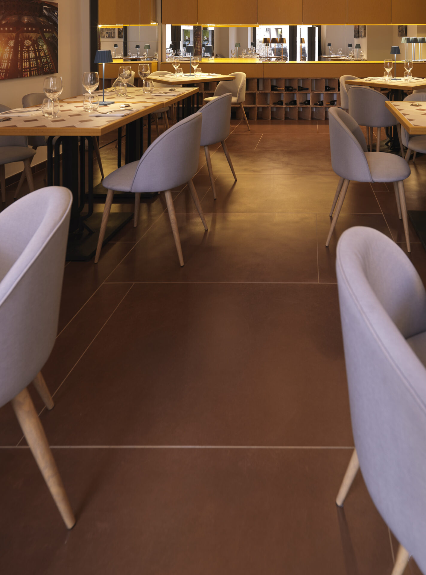 The material theme of the floor is linked to the service wall: here the wines are displayed on an open terracotta bottle rack that characterises the space with sun screen-effect slats at different angles. The Patina porcelain stoneware floor tiles in the Marsala colour and the vertical terracotta-coloured backgrounds create an informal conversation, just like that of the diners in the restaurant sitting on the retro grey fabric armchairs.