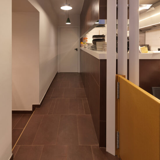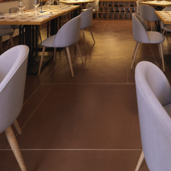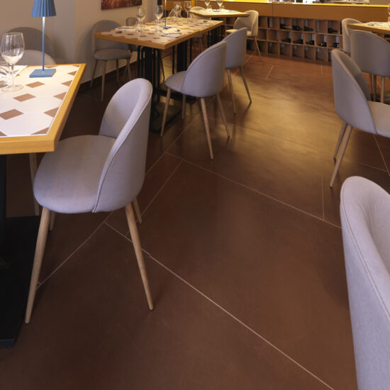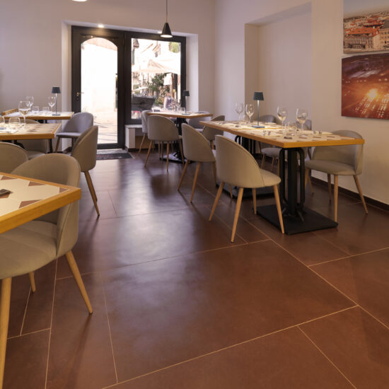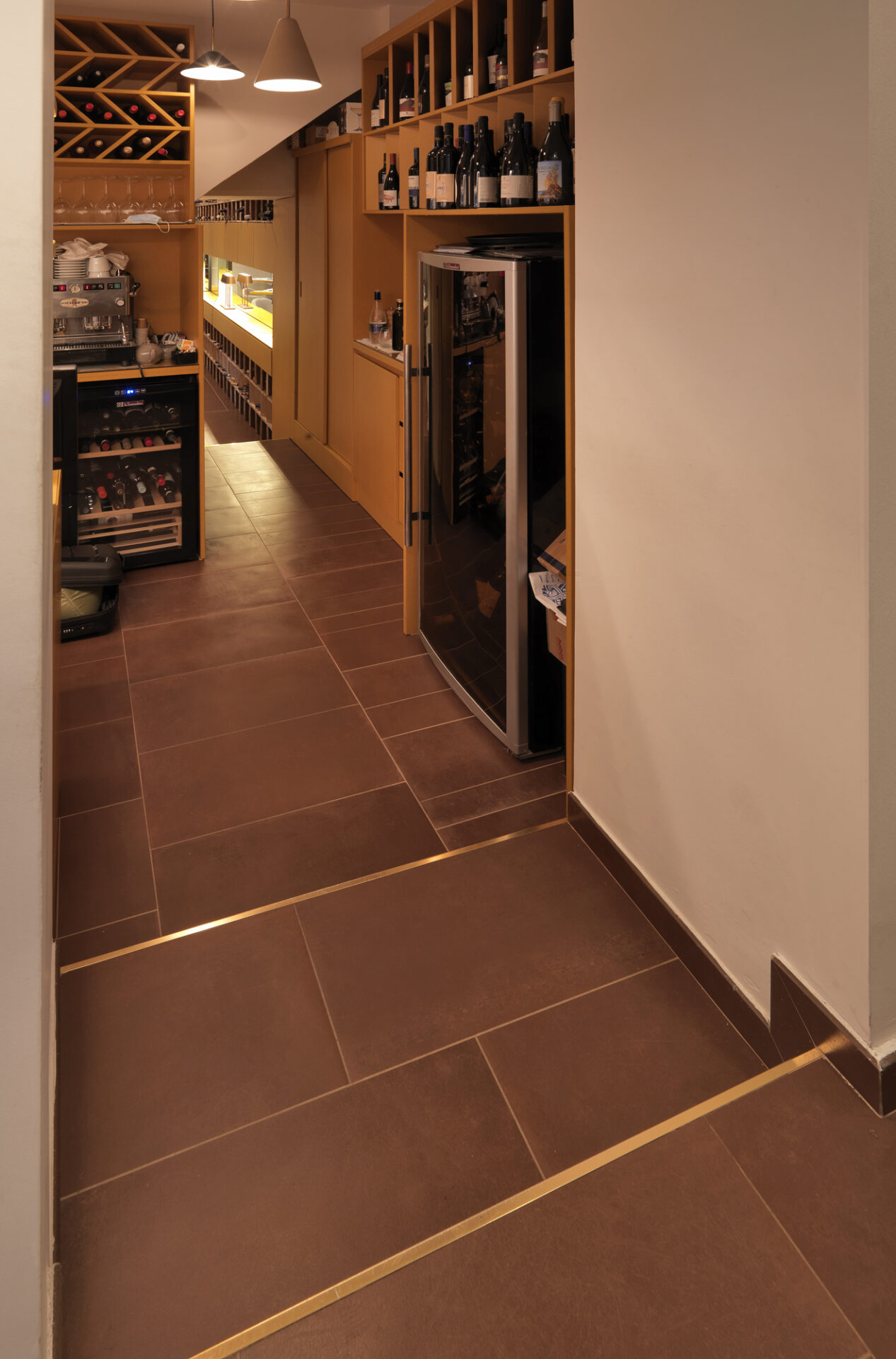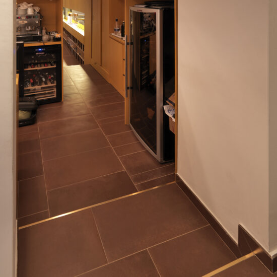 Patina porcelain stoneware in the Marsala colour was chosen for the floor covering. The two sizes used – 30×60 cm and 75×150 cm – are specially cut to create dynamic ‘tone on tone’ geometric patterns. It is a delicate reworking of a ceramic surface with a waxed appearance reminiscent of terracotta transformed over the years by time. The noticeable differences in the surface appearance are inspired by craftsmanship, evoking the Italian manufacturing tradition.
