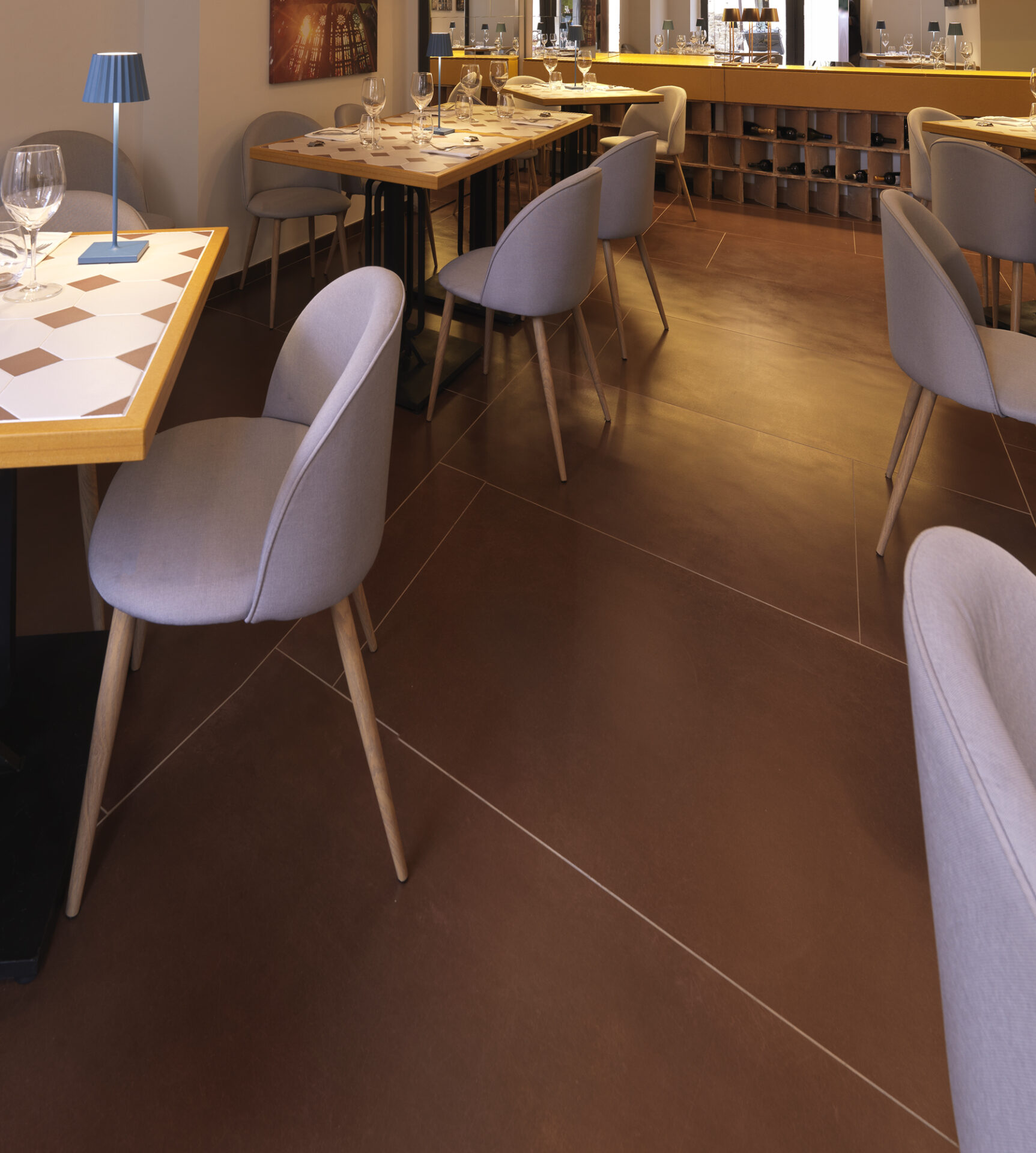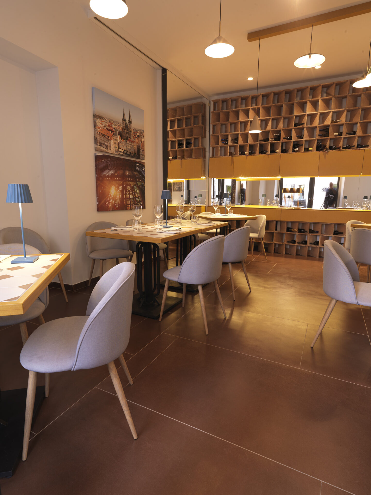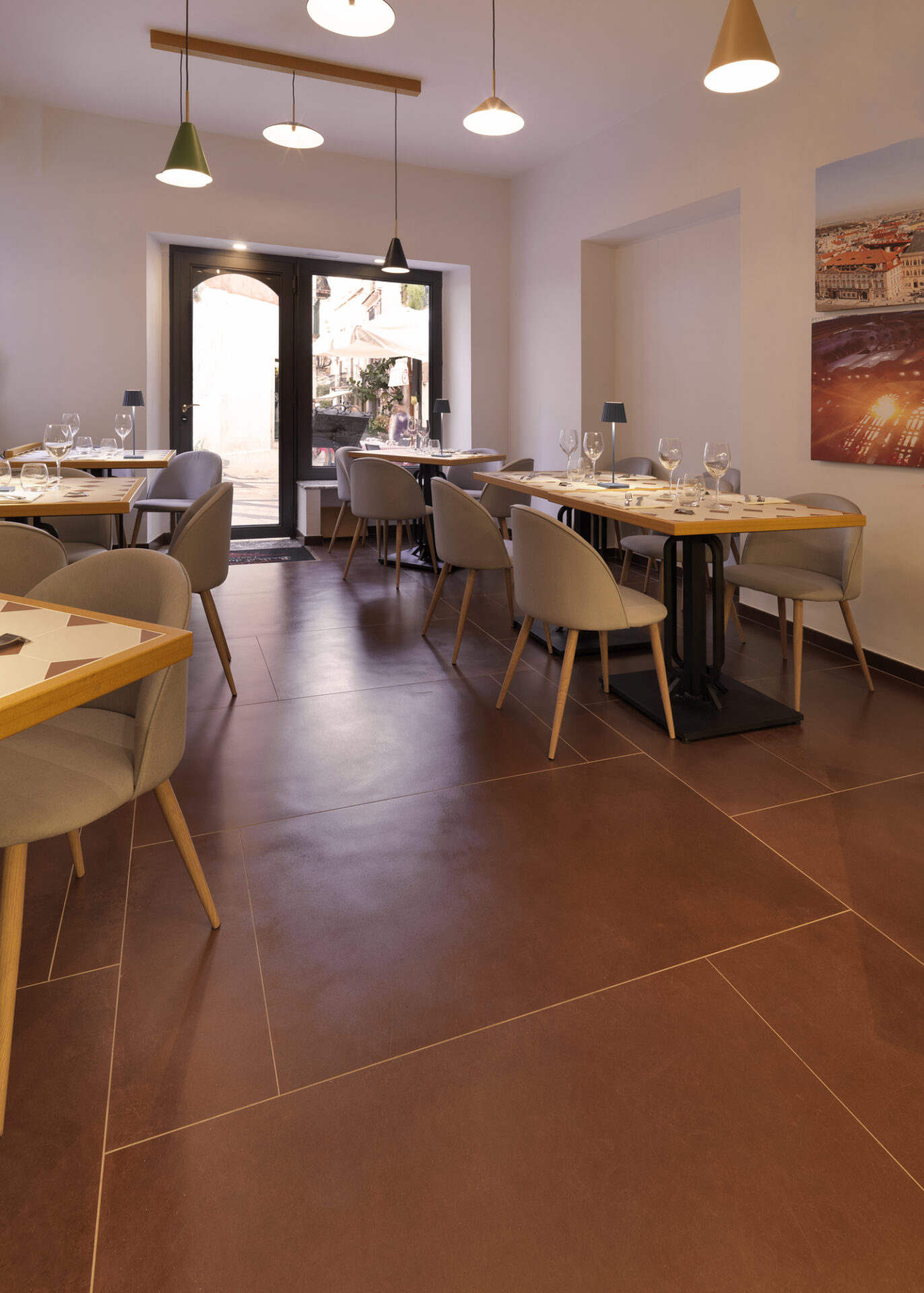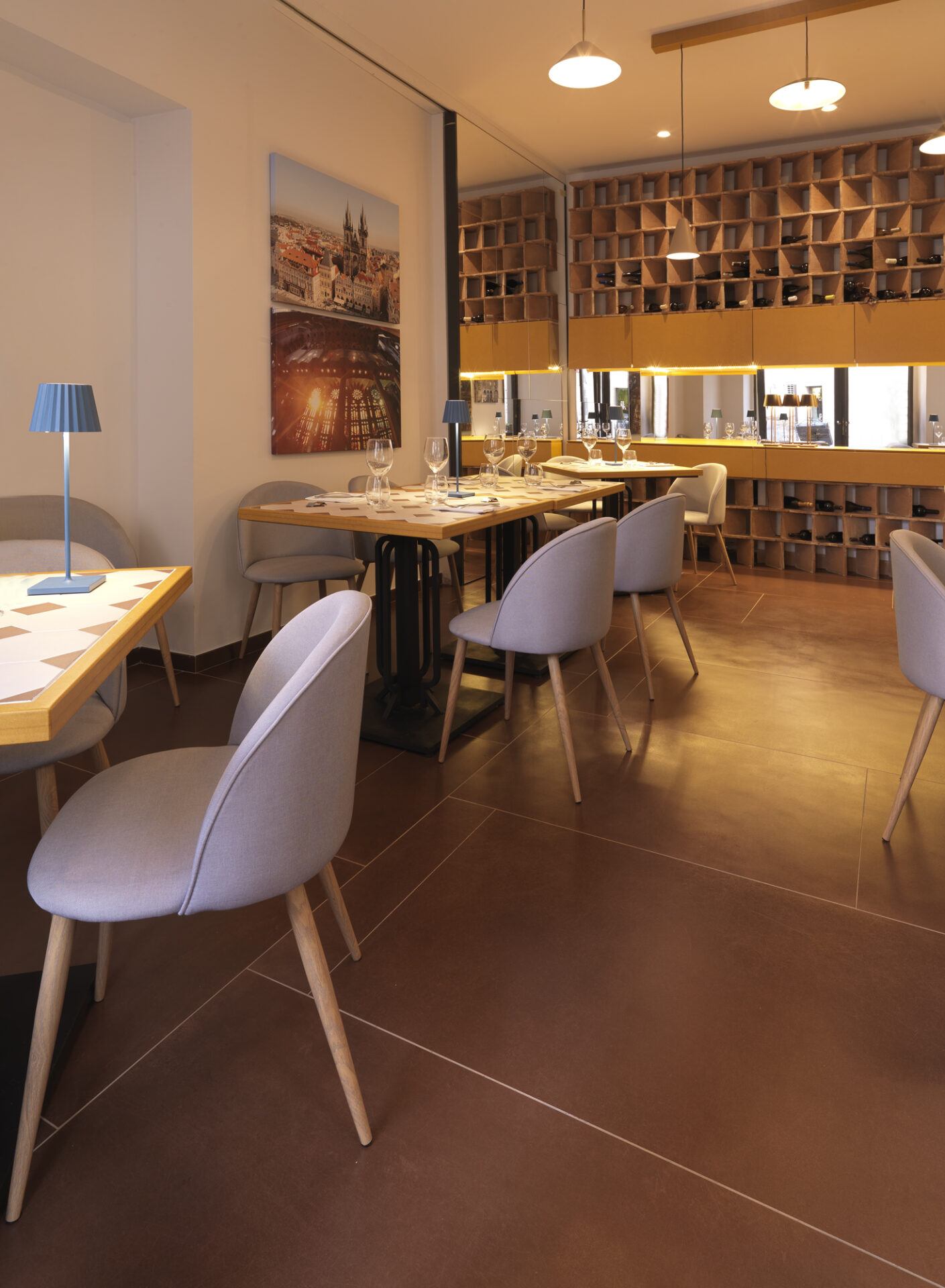 In the heart of Taormina’s historic centre, the Mediterranean atmosphere of the ‘Bistrot du monde’ restaurant is revitalised with stoneware tiles from the Patina collection