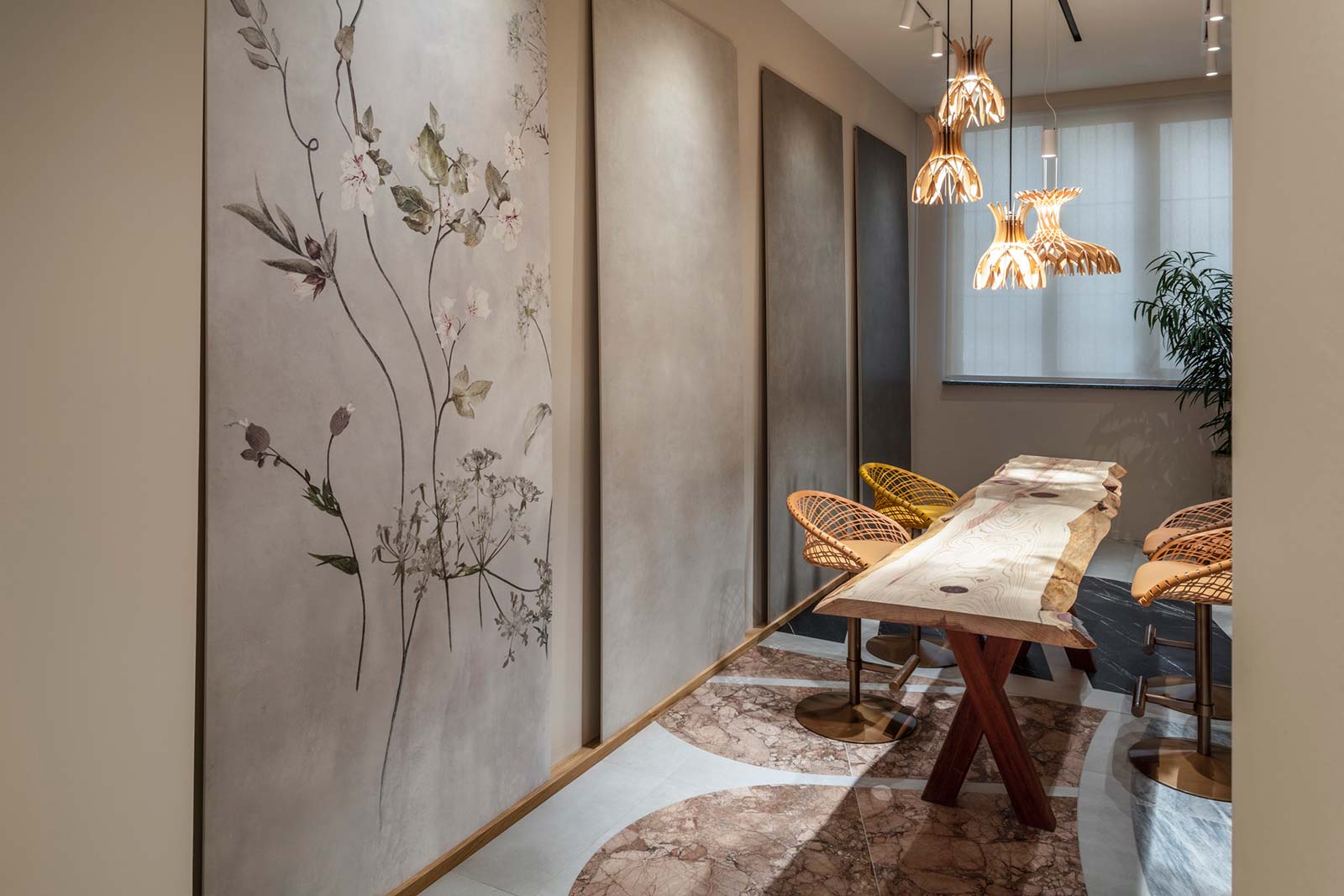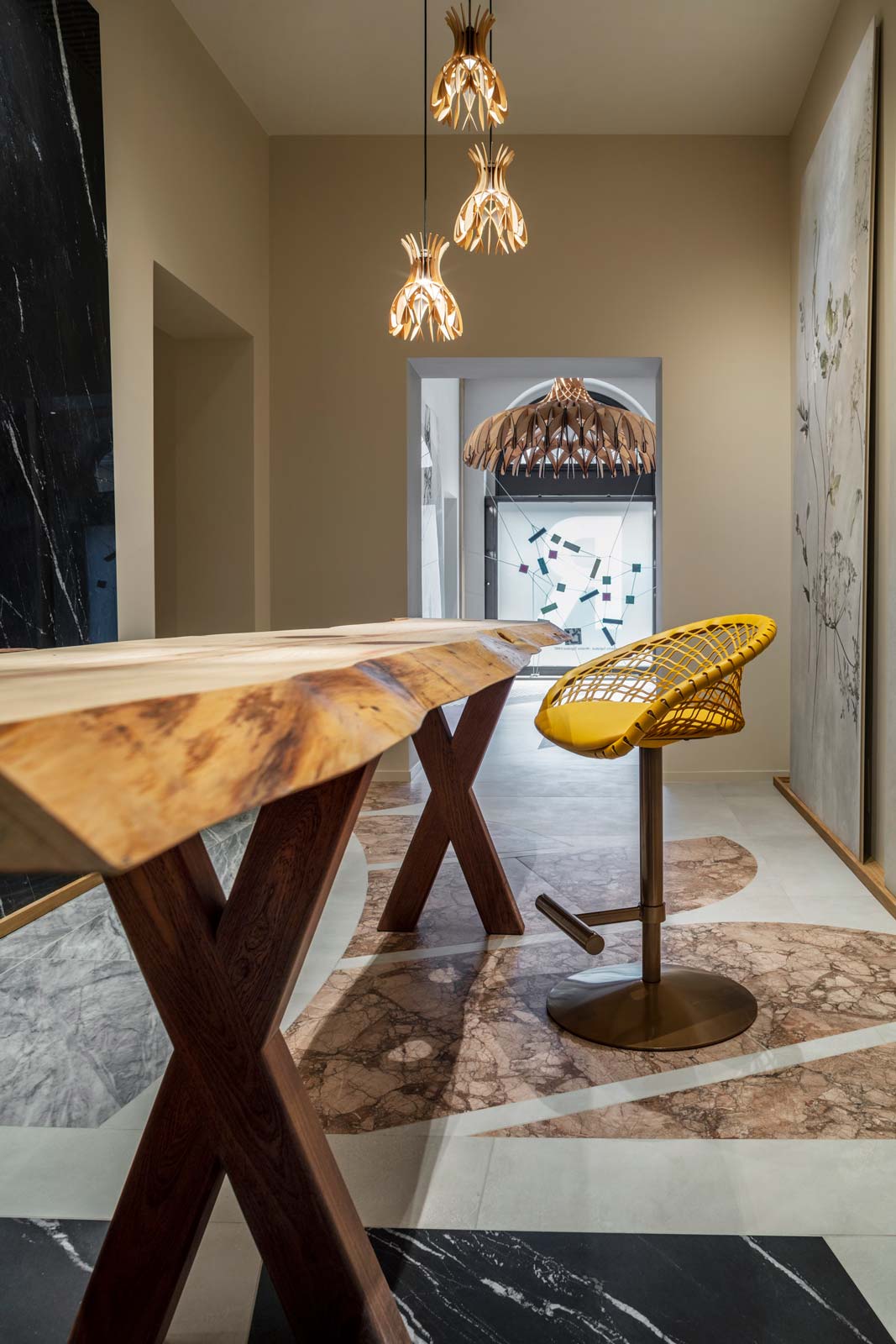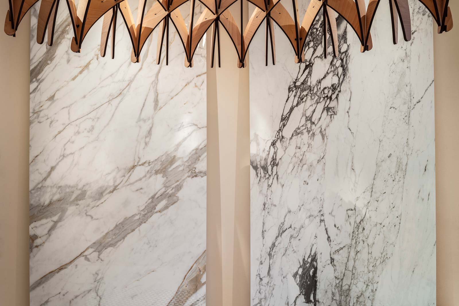 Visitors are aware of this fascination right from the entrance to the showroom, starting with the show windows, where the large slimline stoneware slabs of the Incanto collection strike an attractive balance with the small, super-glossy, hyper-decorated ceramic tiles of Storie, with a system of intersecting cable ties that again evoke the geometric forms of a spider’s web.