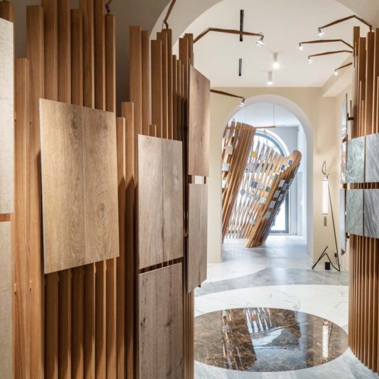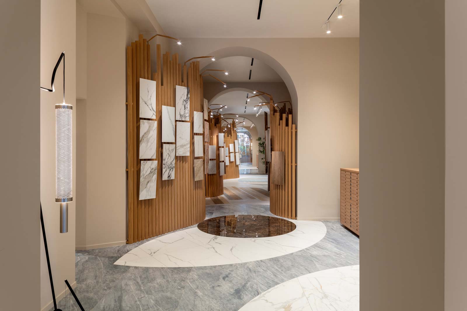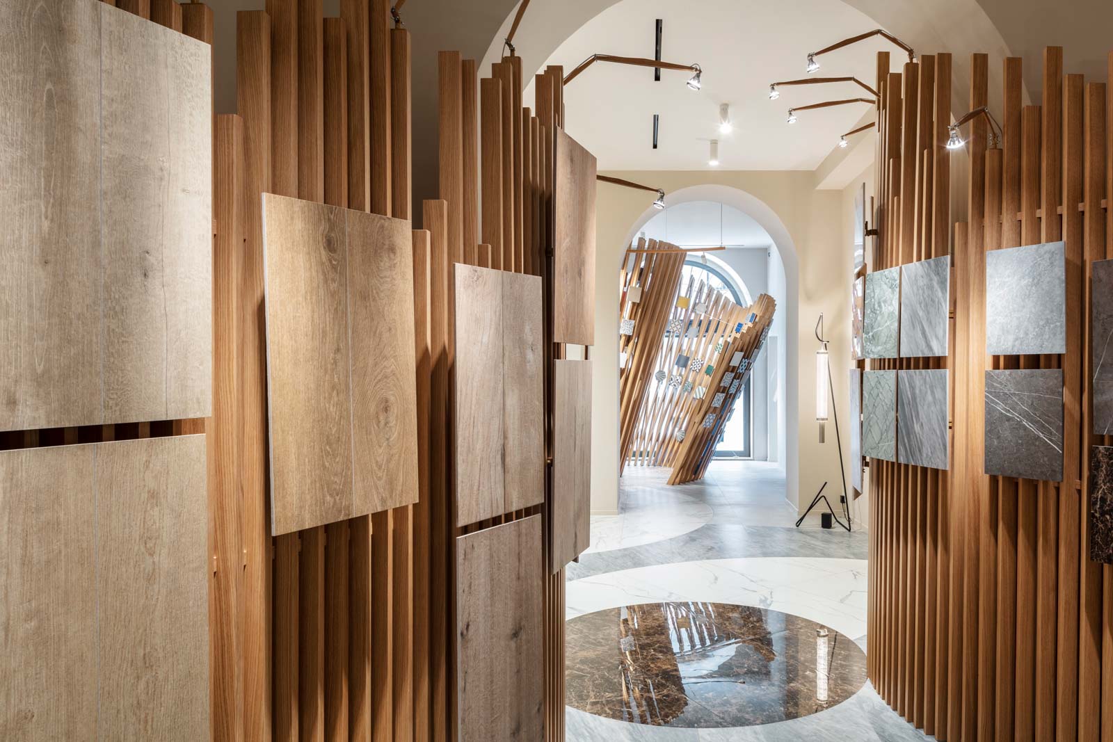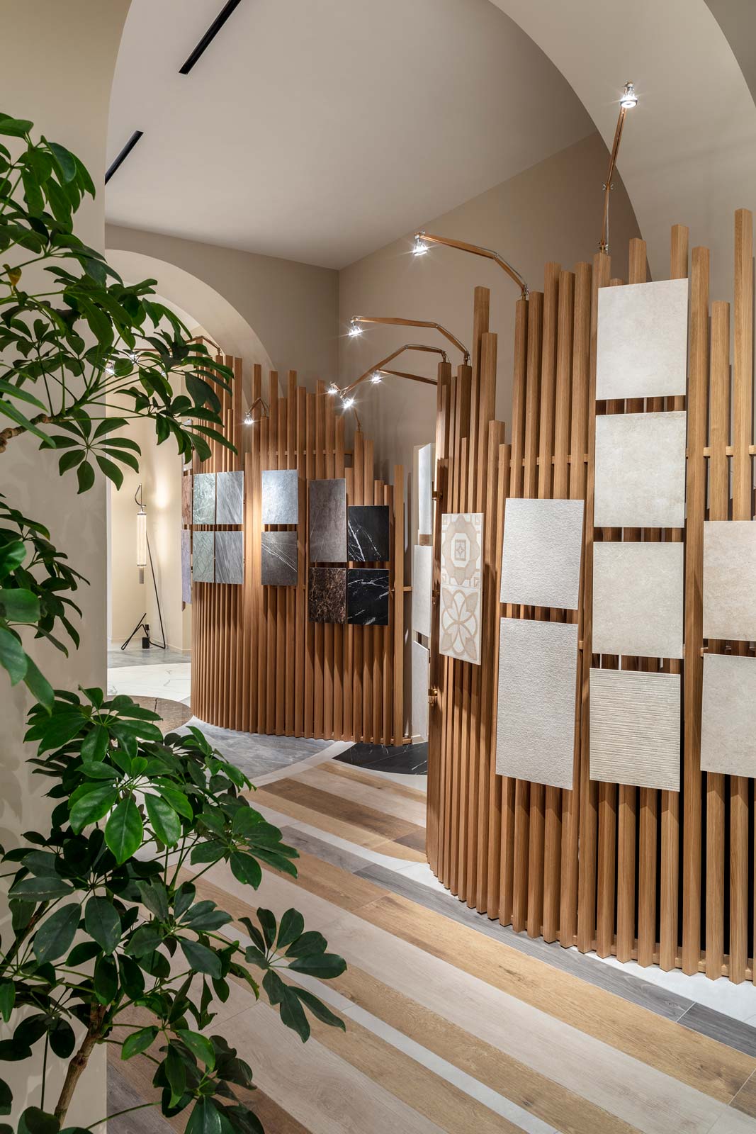 Its various rooms defined by a long succession of archways, the Ragno showroom presents the ceramic and stoneware collections using a completely original mode of display, which exhibits a wide variety of ceramic materials available to architects and consumers while suggesting exclusive combinations of the different surfaces in the range.