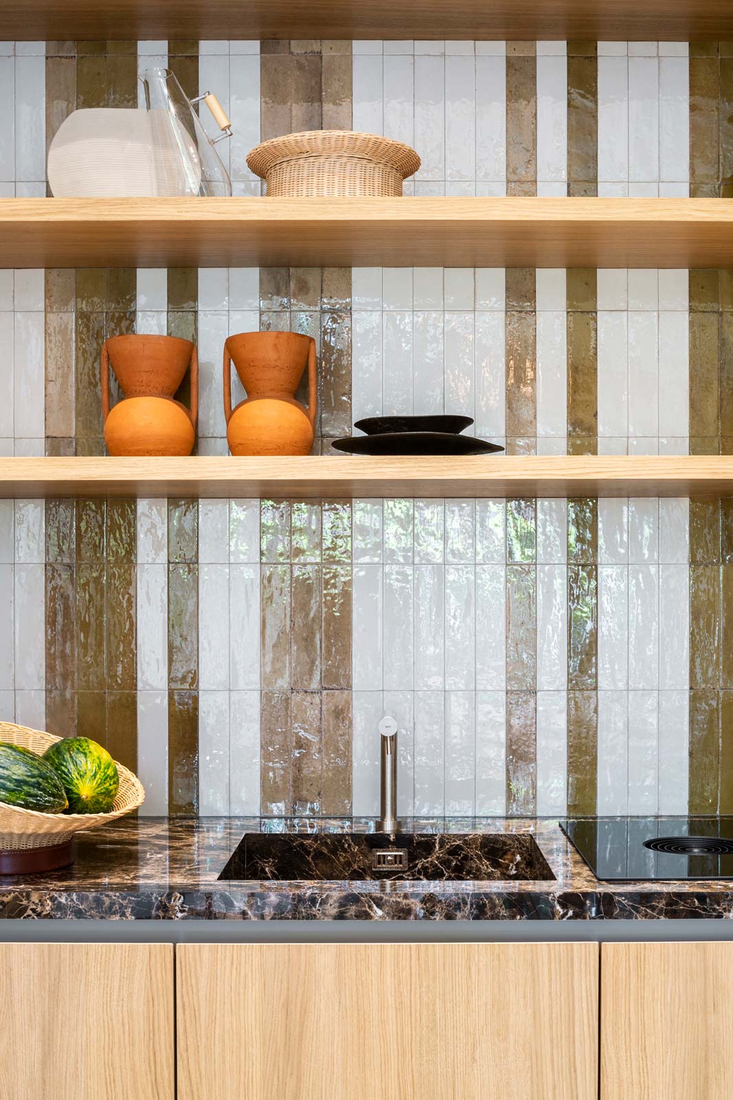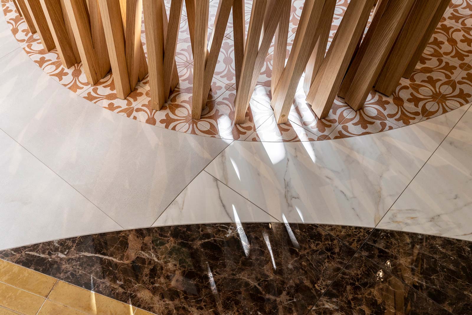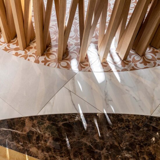 “The floor is the other very impressive feature of this project,” Benedetta Tagliabue continues, “as it is a single, large mosaic, a real multicolor work of art, that demonstrates stoneware’s immense power to establish a dialogue between glossy and matt collections inspired by different materials, from wood to marble and from concrete to stone, in an absolutely natural harmony.”