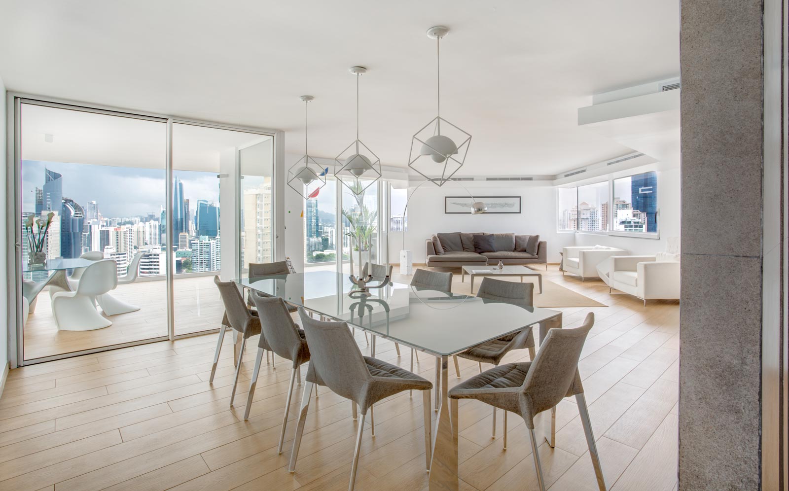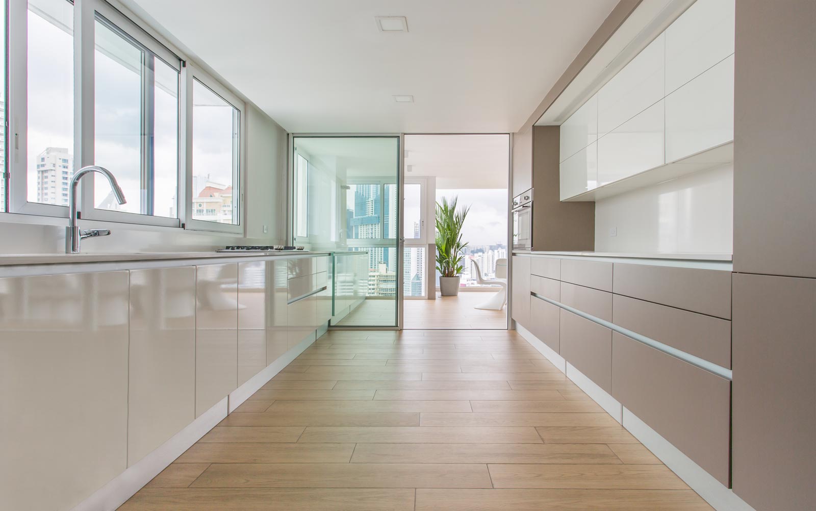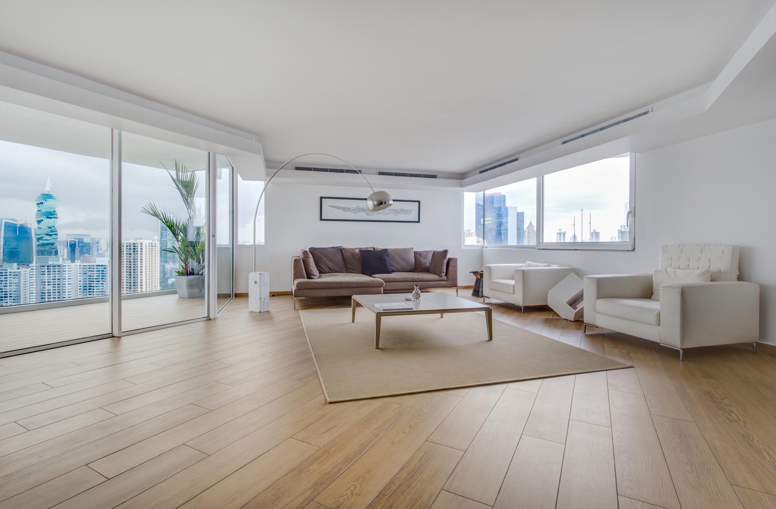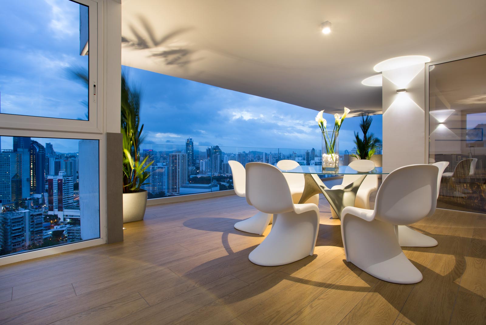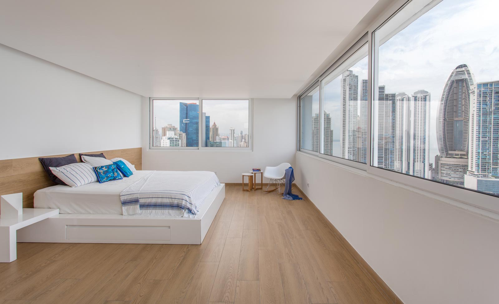 We are on the twenty-sixth floor of a skyscraper in Punta Paitilla, a residential district of Panama City, a factor which alone is enough to guarantee that an apartment's interior will be light-filled and airy. The various rooms were designed with their relationship to the outdoors in mind, with a unique, exquisite continuity, where even the sky and its colours play a clearly defined role. The blue of daytime and the lights of night-time dialogue through a series of large windows, with subtle, neutral modulation of the living and sleeping areas. The choice of neutral, unobtrusive colours encourages a mood of relaxation, and in the bathrooms it helps to define the visual, tactile well-being which originated in spas and wellness centres but has now also become popular in home design.