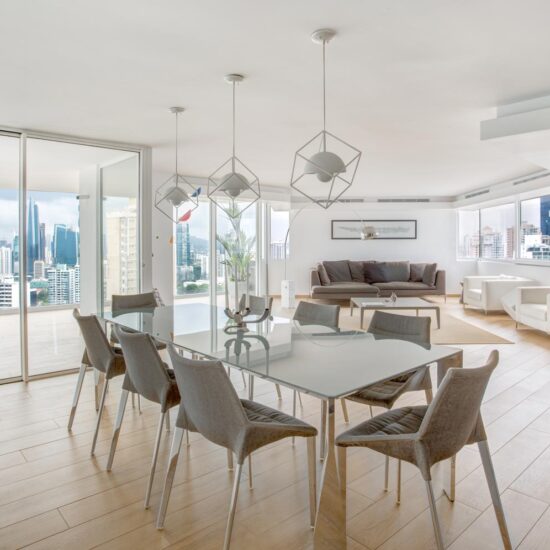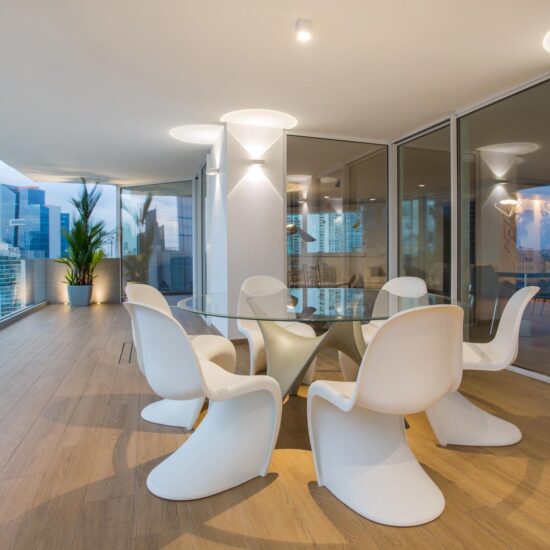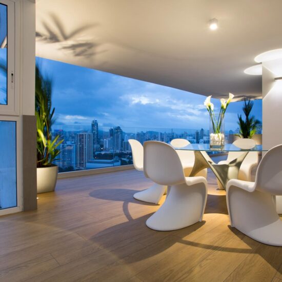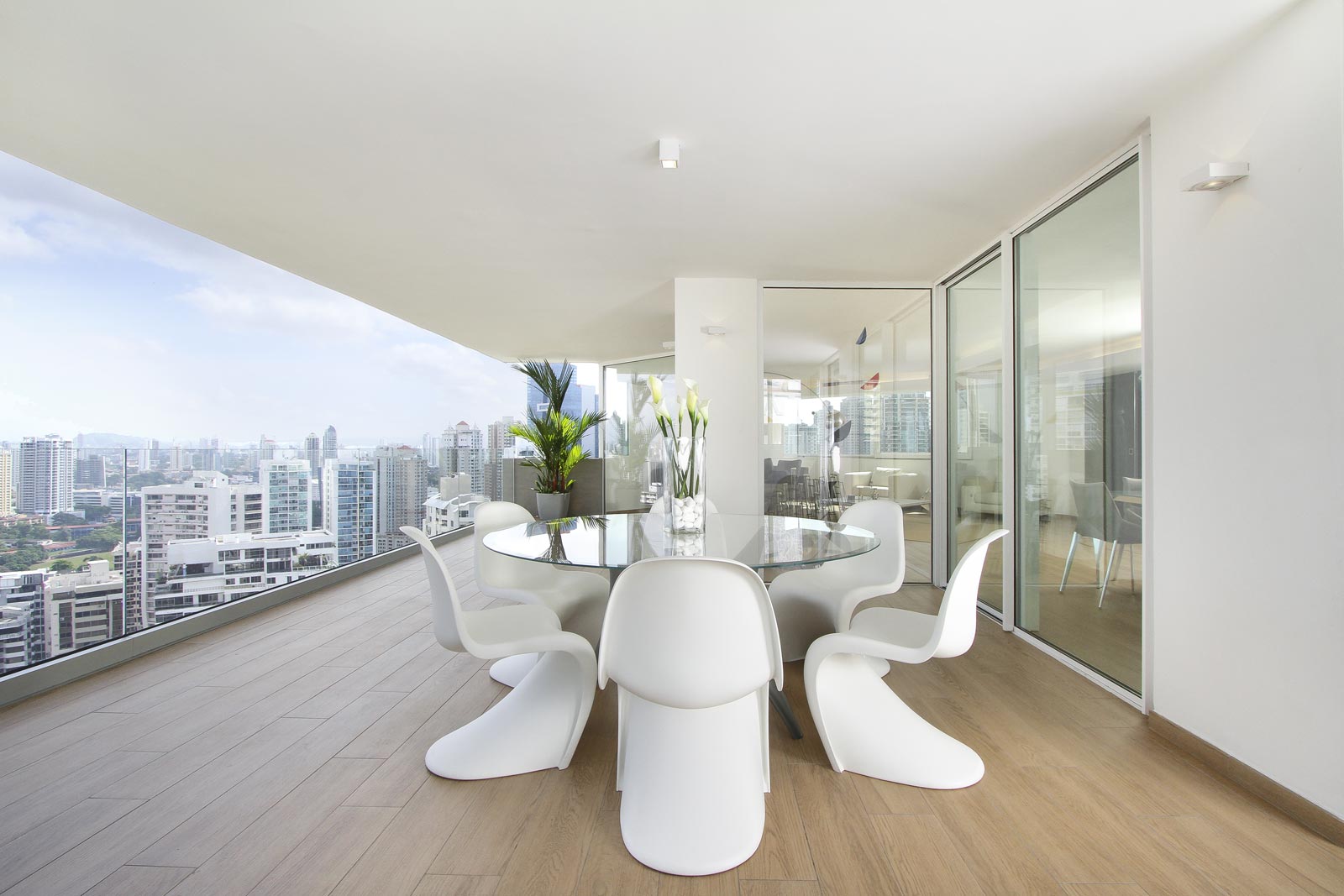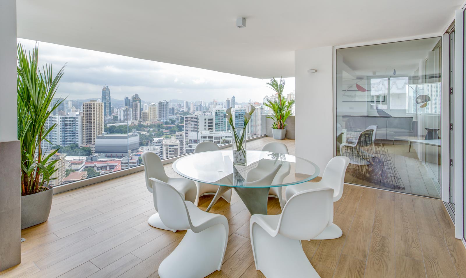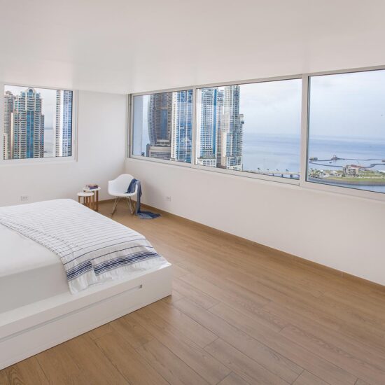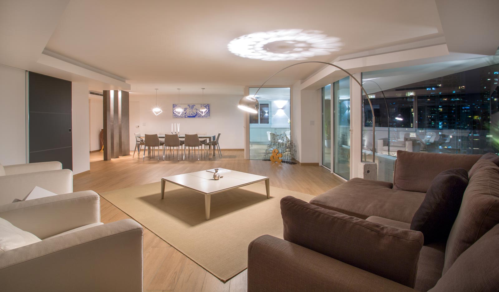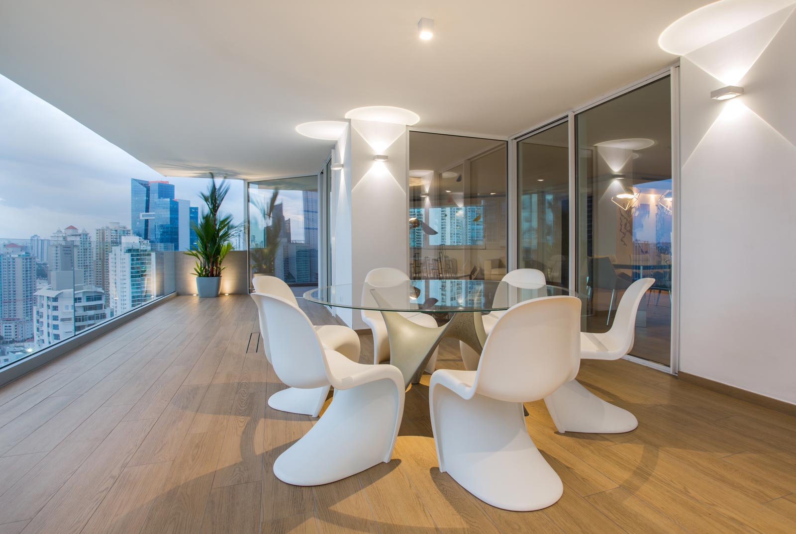 We are on the twenty-sixth floor of a skyscraper in Punta Paitilla, a residential district of Panama City, a factor which alone is enough to guarantee that an apartment's interior will be light-filled and airy. The various rooms were designed with their relationship to the outdoors in mind, with a unique, exquisite continuity, where even the sky and its colours play a clearly defined role. The blue of daytime and the lights of night-time dialogue through a series of large windows, with subtle, neutral modulation of the living and sleeping areas. The choice of neutral, unobtrusive colours encourages a mood of relaxation, and in the bathrooms it helps to define the visual, tactile well-being which originated in spas and wellness centres but has now also become popular in home design.