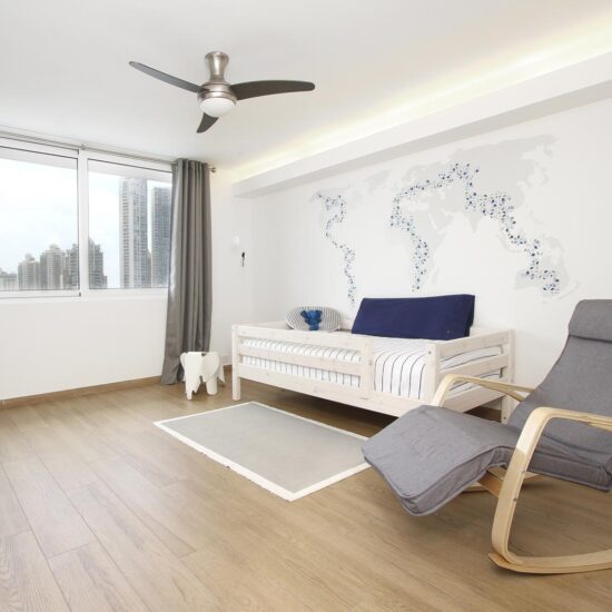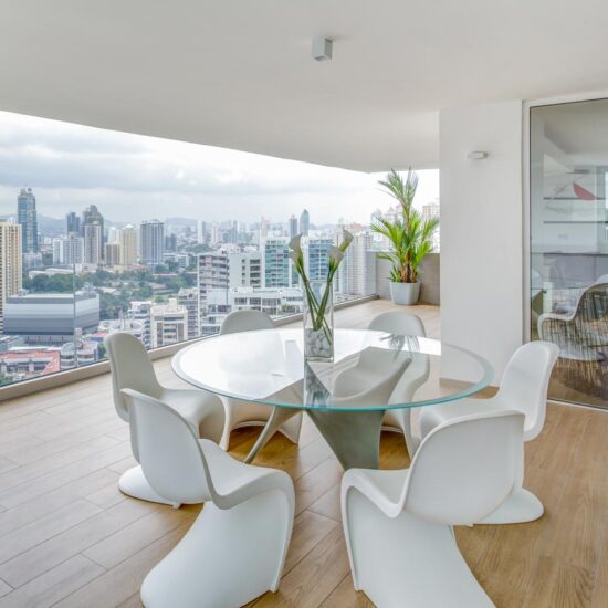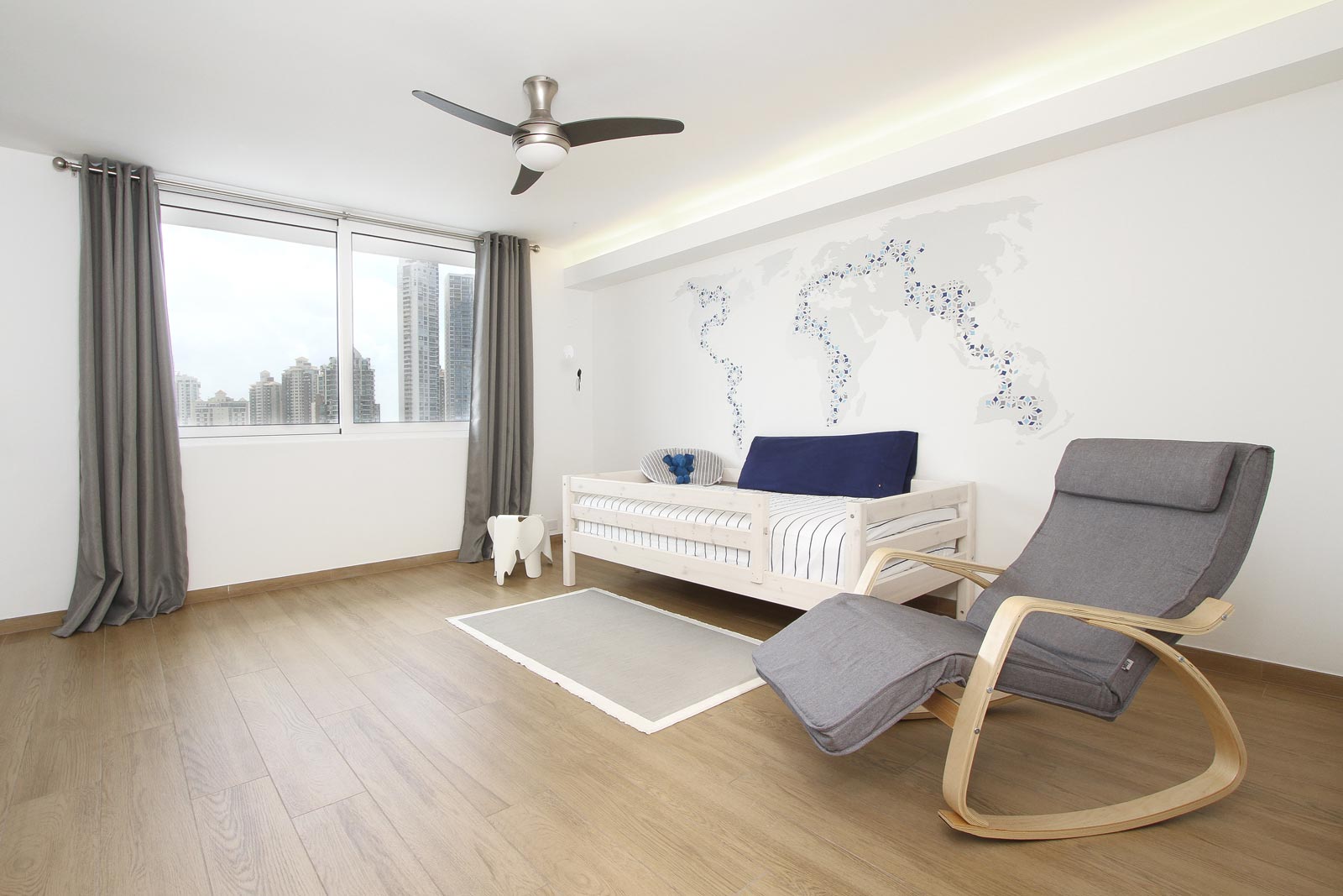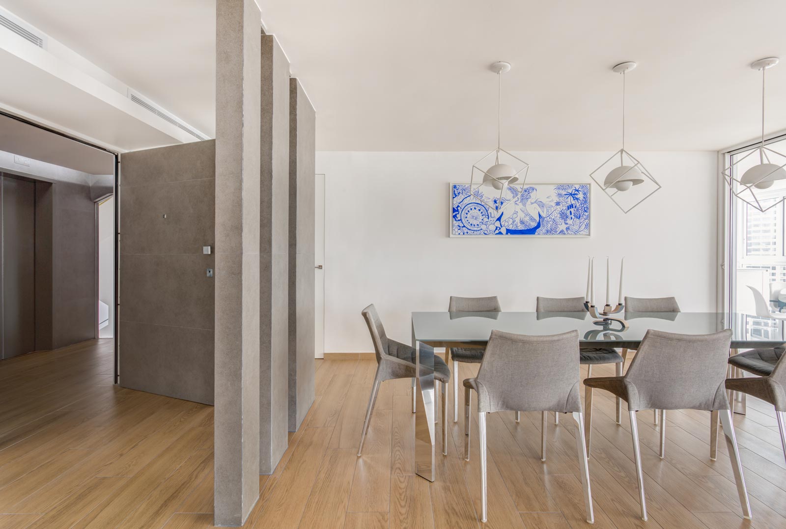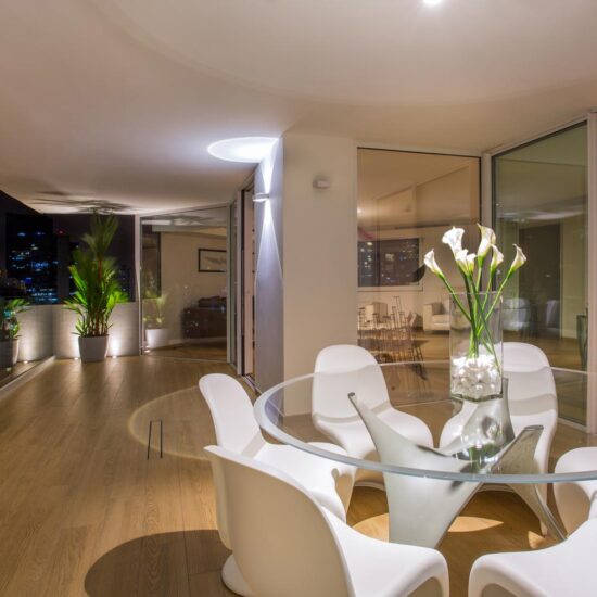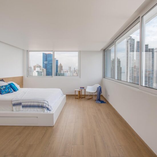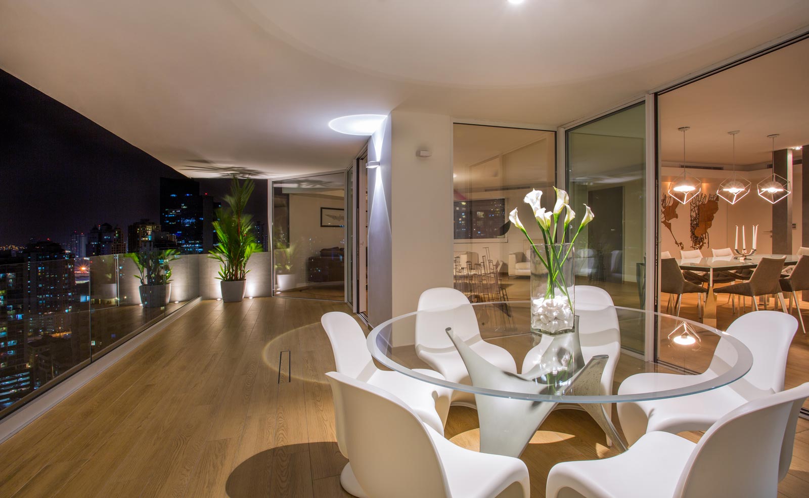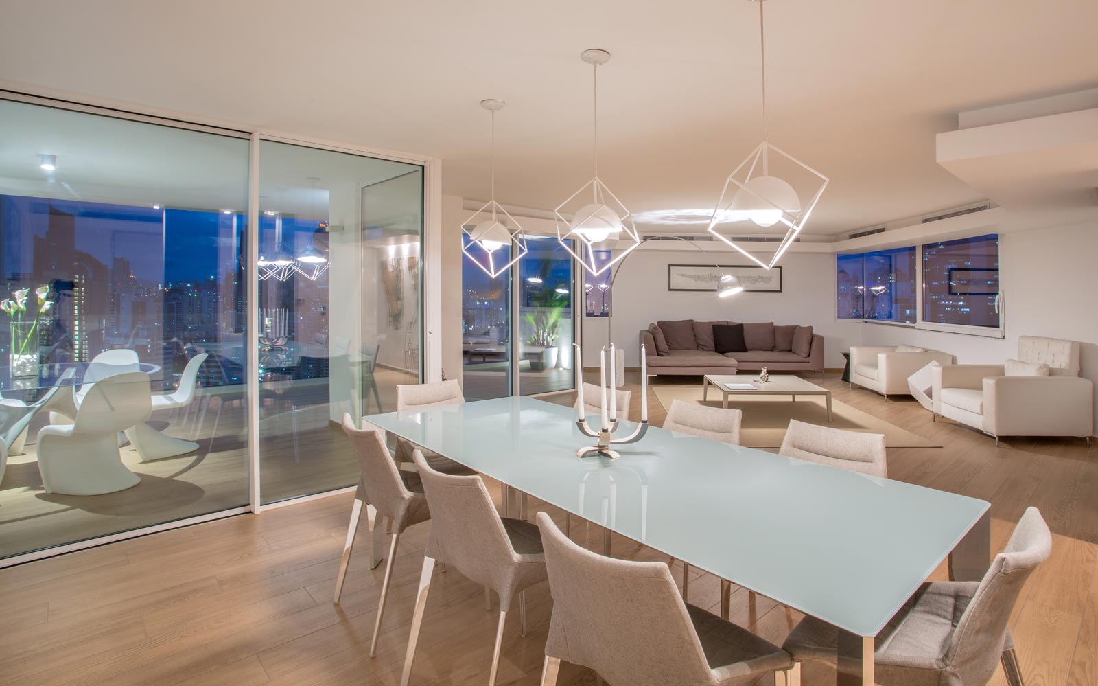 We are on the twenty-sixth floor of a skyscraper in Punta Paitilla, a residential district of Panama City, a factor which alone is enough to guarantee that an apartment's interior will be light-filled and airy. The various rooms were designed with their relationship to the outdoors in mind, with a unique, exquisite continuity, where even the sky and its colours play a clearly defined role. The blue of daytime and the lights of night-time dialogue through a series of large windows, with subtle, neutral modulation of the living and sleeping areas. The choice of neutral, unobtrusive colours encourages a mood of relaxation, and in the bathrooms it helps to define the visual, tactile well-being which originated in spas and wellness centres but has now also become popular in home design.