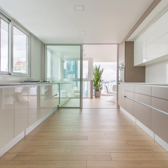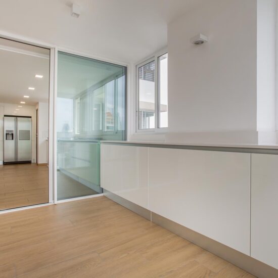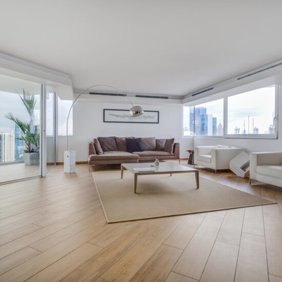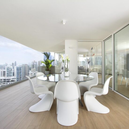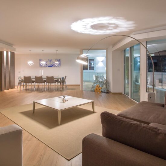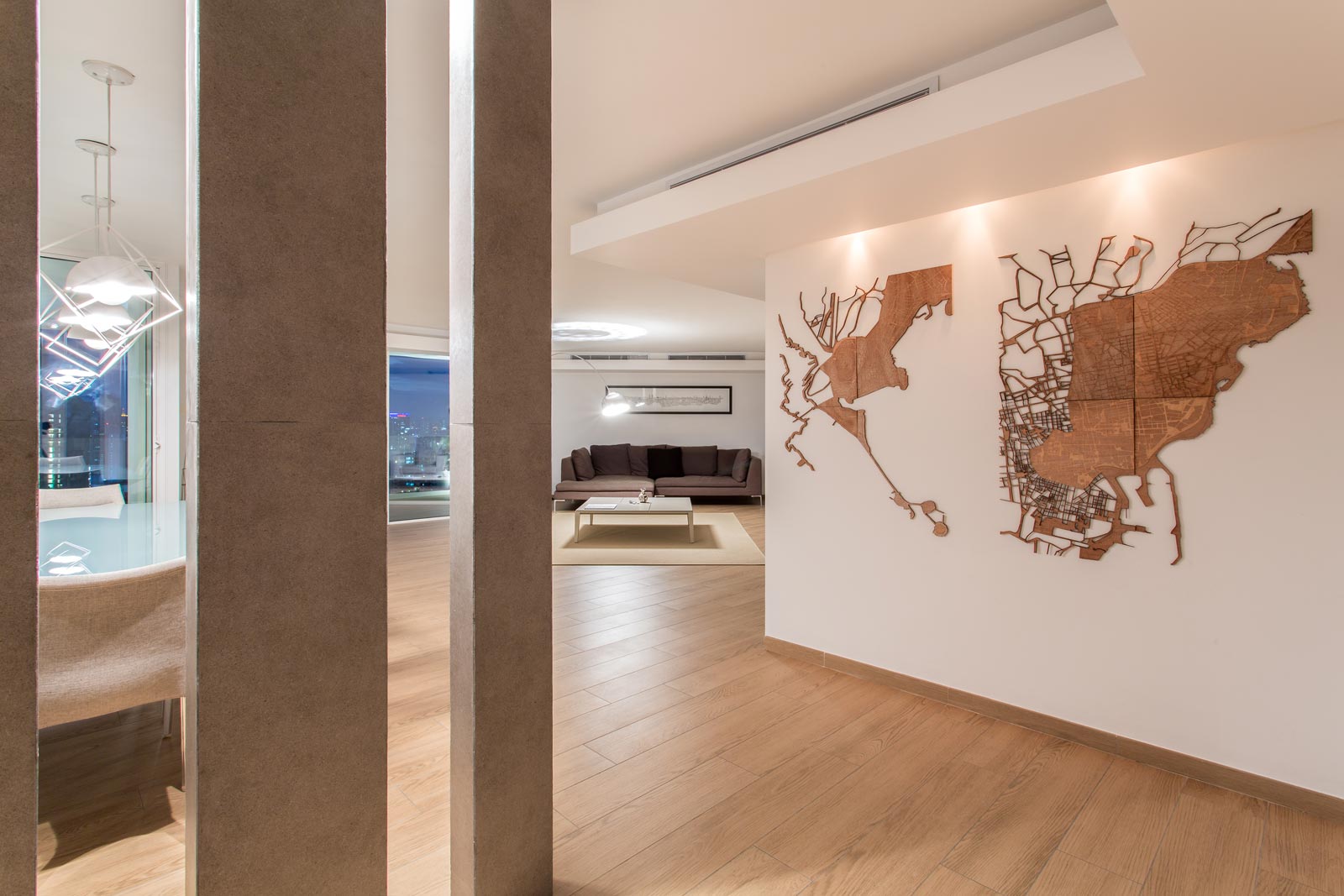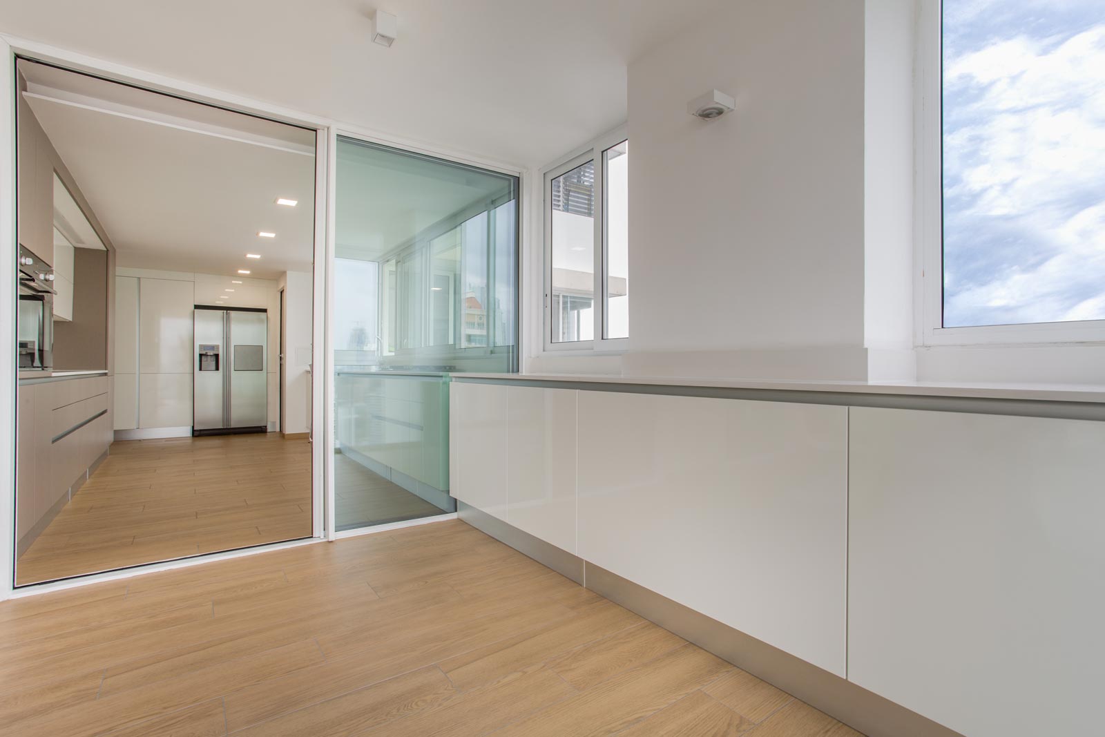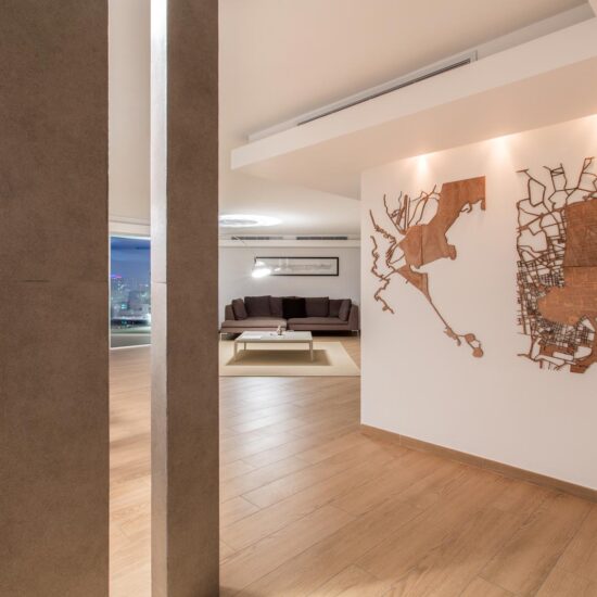 Wood-effect and stone-effect porcelain stonewares used for the interiors of an airy, light-filled apartment where the sky is also a major player.