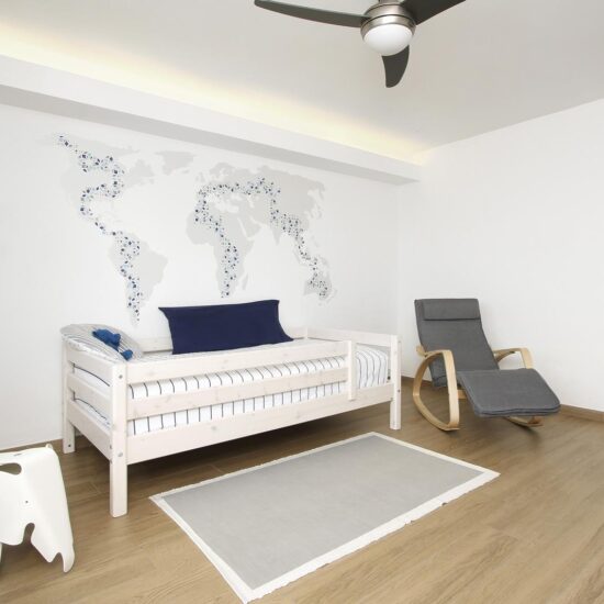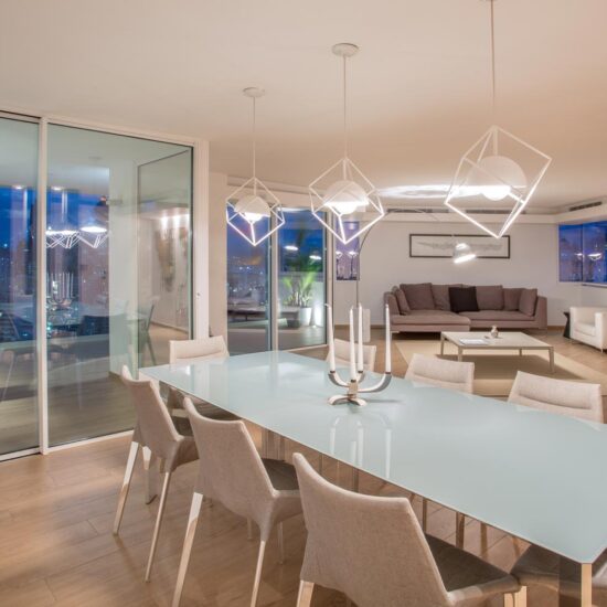 The continuity of neutral colours is only interrupted in sections by touches of colour, particularly various shades of blue, used on all occasions to highlight details and accessories chosen for continuity with the outdoors. The sky enters every room thanks to the large strip, or floor-to-ceiling, windows.