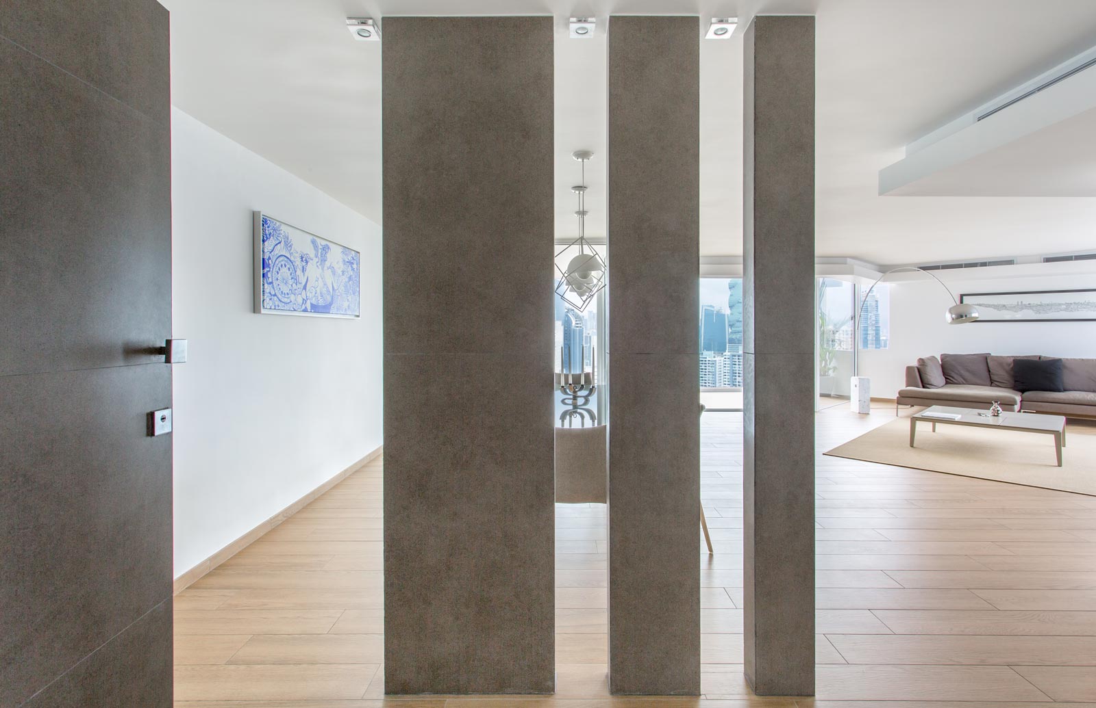 Wood-effect and stone-effect porcelain stonewares used for the interiors of an airy, light-filled apartment where the sky is also a major player