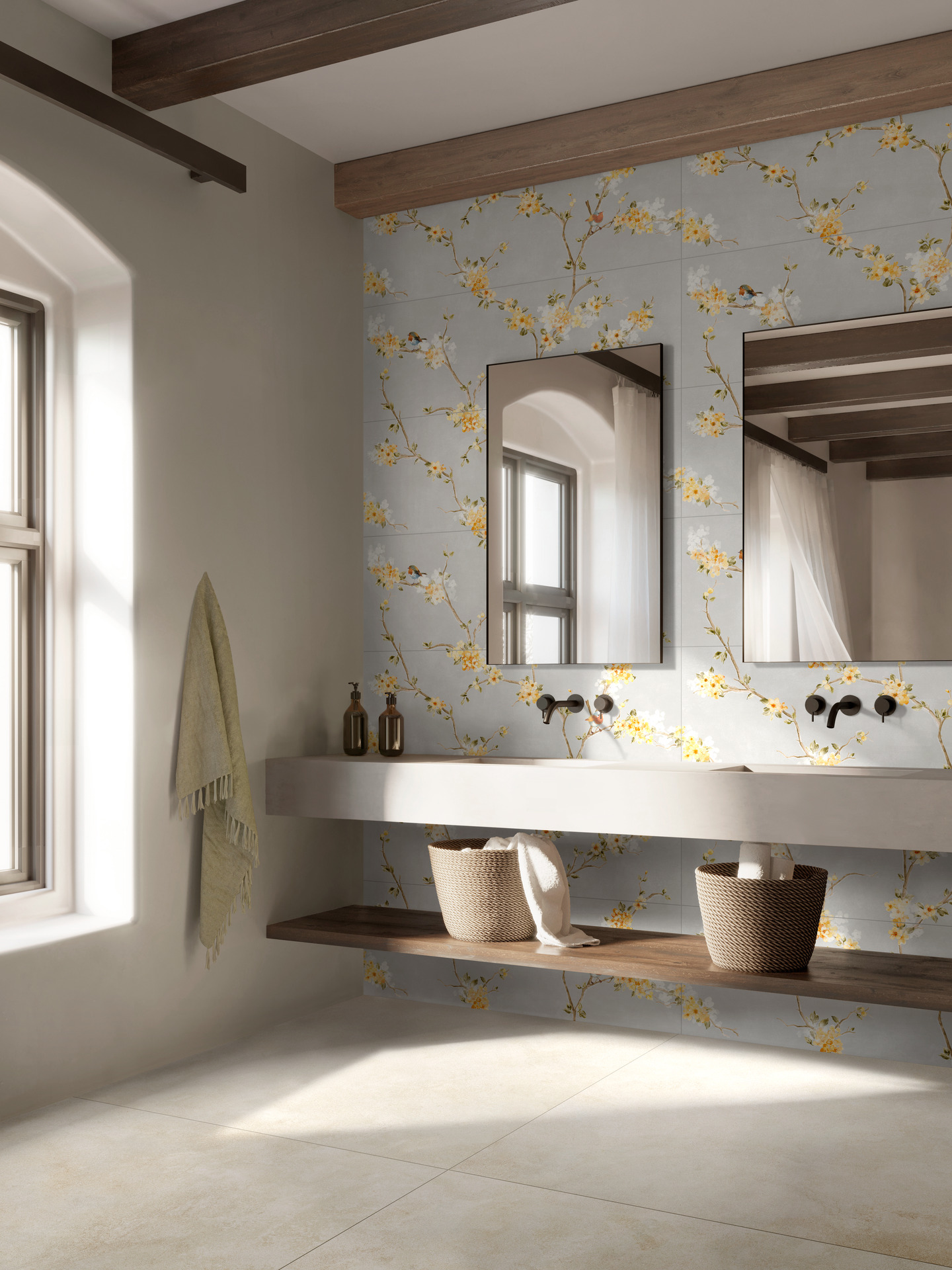The Ragno collections interpret this trend with a unique and sophisticated style, offering ceramic surfaces that recall the charm of wallpaper with the technical quality of porcelain stoneware and the most advanced ceramics. The motifs range from the lightest and most delicate floral patterns, ideal for romantic or relaxing atmospheres, to graphic and contemporary geometries, perfect for modern and minimalist spaces.