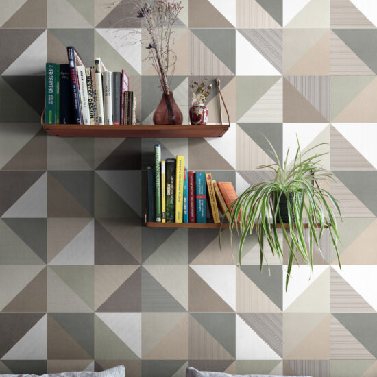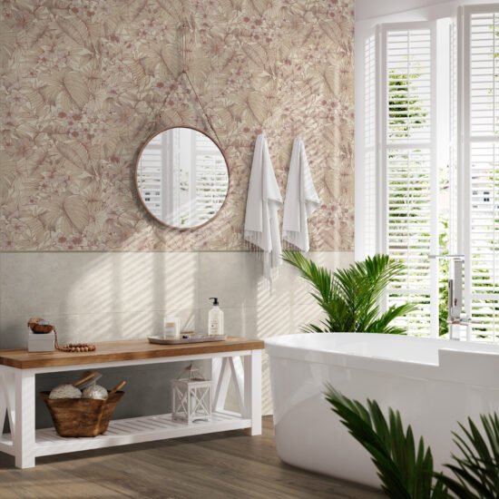Wallpaper-effect ceramic coverings integrate perfectly with neutral and natural palettes – such as white, grey, and beige – creating welcoming and harmonious spaces. In a modern living room, floral or geometric versions in soft tones – such as mosaic – pair well with light linen sofas, light wood, and metallic details.
