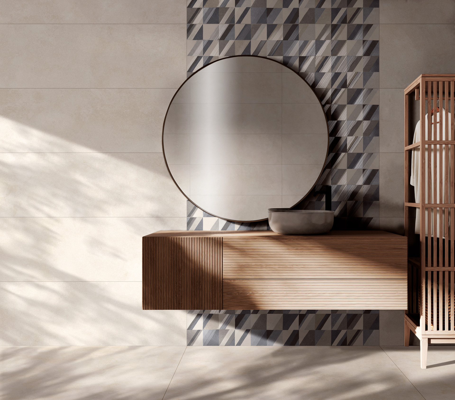 Ragno’s collections offer coverings designed both for those who love minimalist rigor and for those who prefer a more decorative and enveloping aesthetic: in modern living rooms, wallpaper-effect tiles with geometric motifs, sandblasted textures, or light reliefs can turn the wall into an active, almost sculptural architectural element.