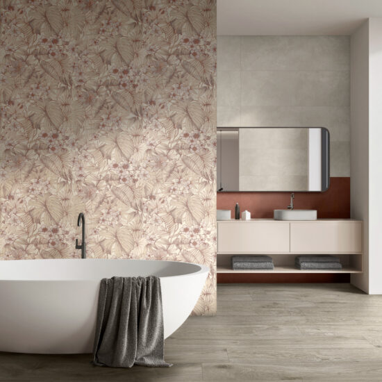 Choosing a ceramic wall covering with a wallpaper effect means combining the decorative charm of traditional wallpaper with the advanced technology of porcelain stoneware. Whereas wallpaper can be vulnerable to humidity, heat, and time, ceramic guarantees superior resistance and easy maintenance, without sacrificing aesthetics.