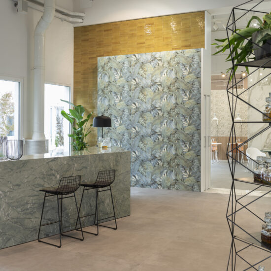 Large slabs, small-size tiles and geometrical, floral and tropical decors: the new Ragno showroom exhibits all the possible combinations of sizes, effects, finishes and moods.