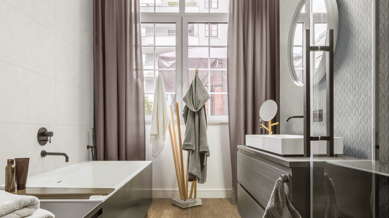 Choose delicate colors and natural shades such as beige and grey to give an interior greater harmony and maintain a mood of serenity. If you wish to introduce color contrasts or patterns, you might use them for the shower area, visually distinguishing it from the rest of the bathroom.