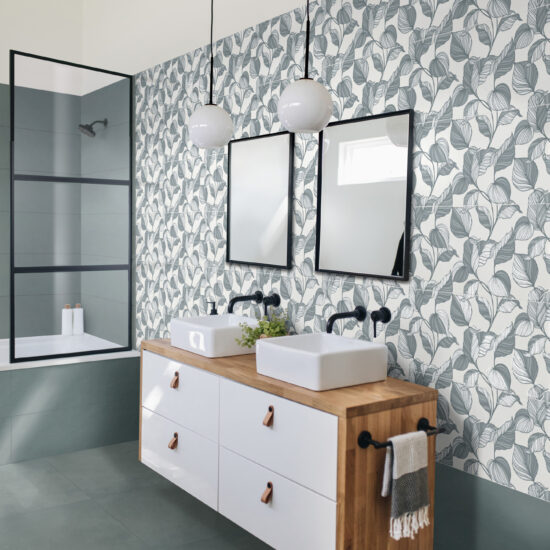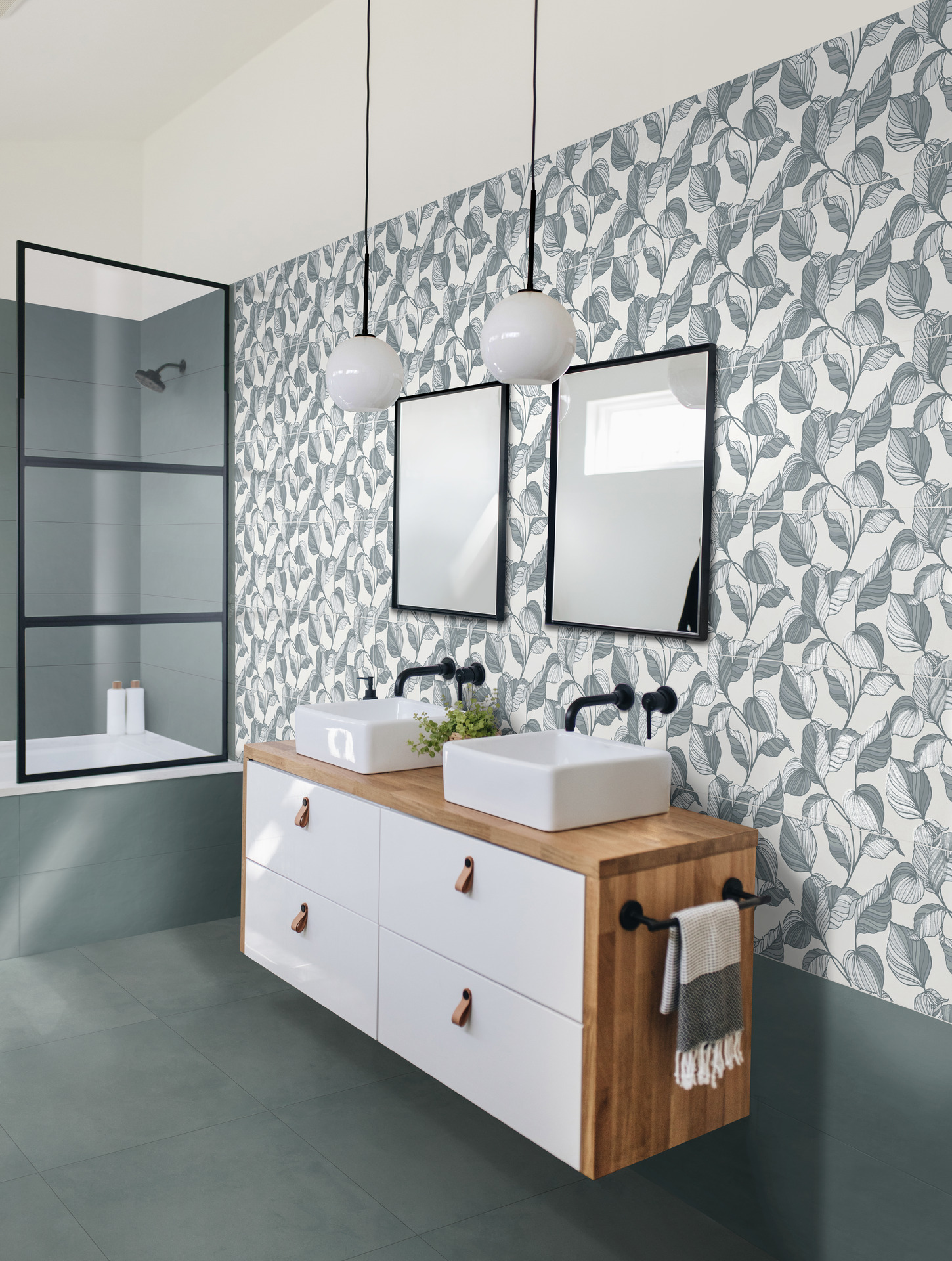 For a more original option, on the other hand, you can apply large tiles on 3 walls and then add decors and textures using small tiles on the last wall, generally the one behind the mirror. Experiment with our bathroom collections such as Wish, Papers or Stratford Wall, with their range of geometrical patterns, materials and colors, to create a truly unique bathroom with very individual design.