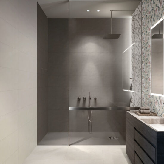 For example, wall recesses are an elegant option for tidy storage of bottles and other items, and also add a touch of style to your shower. However, it’s important to calculate the dimensions of these recesses with care and make sure that they combine attractively with the size of the tiles chosen, to avoid unsightly cuts that may break up the covering’s visual continuity.