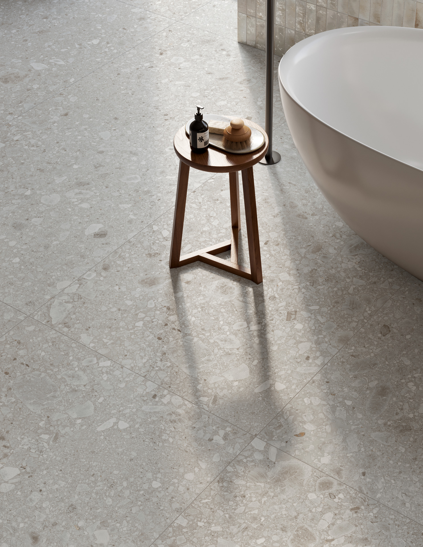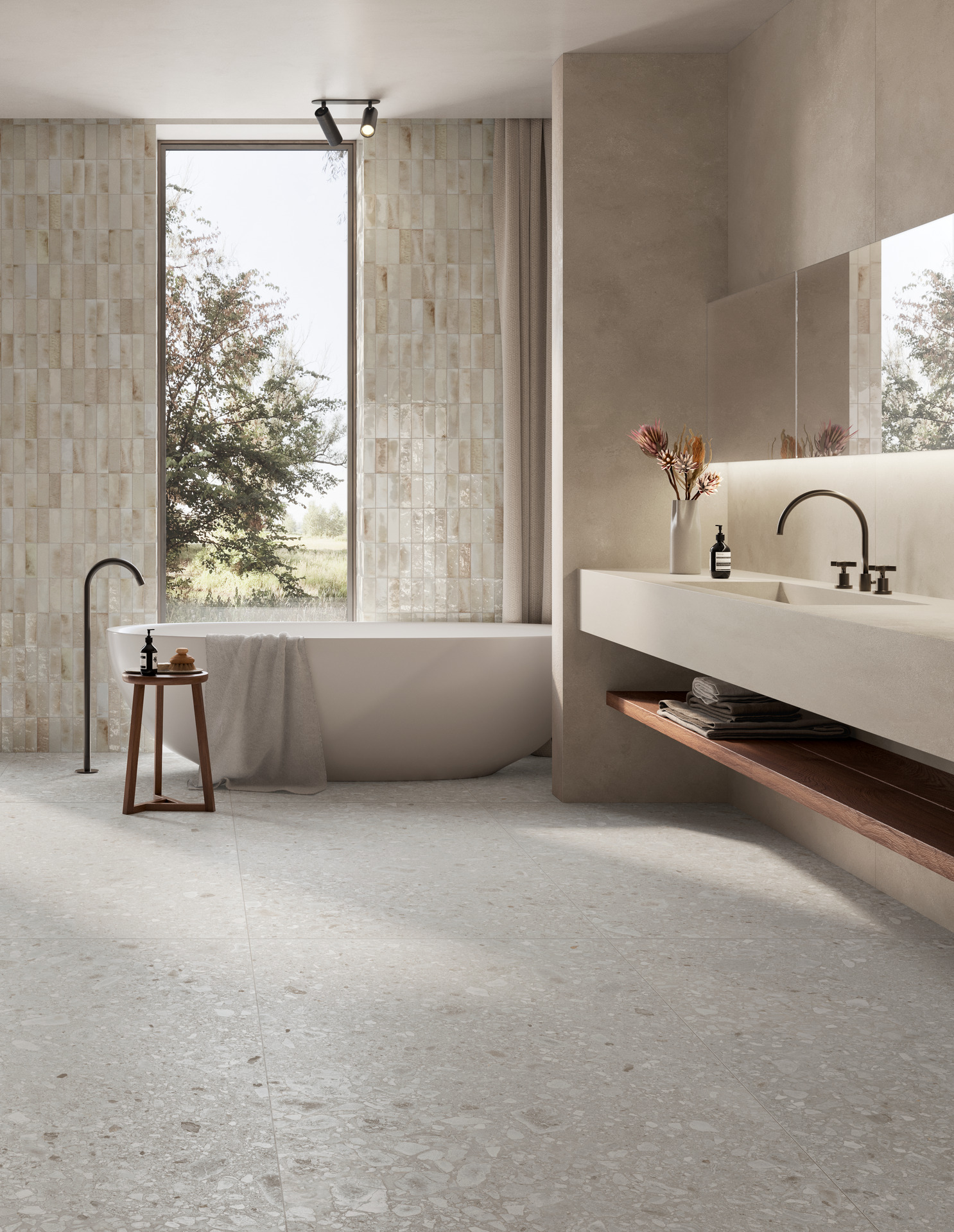 - Ceramic surfaces, such as marble-effect stoneware or stone-effect collections that reproduce travertine or Ceppo di Gré stone, add a touch of classical elegance to spaces.