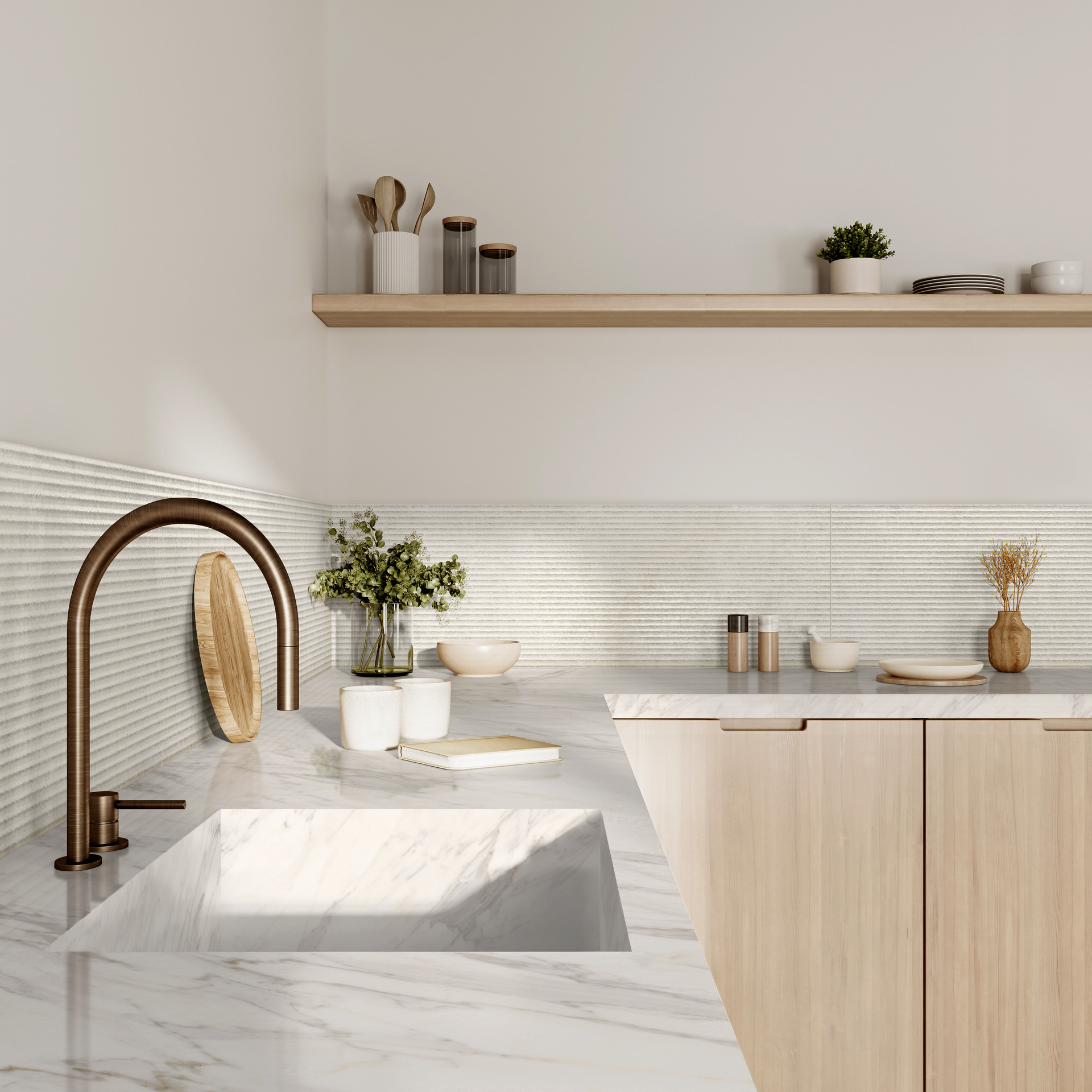 Tiempo Wall’s decorative harmony is expressed in combination with plain tiles and decors with great depth of tactile realism. In fact, each color has its own 3D Saw Structure, extra-thick to emphasise its three-dimensionality and depth. Extremely tactile yet also very simple, the structure evokes a traditional method used by masons when dressing stone: horizontal chiselling with finished edges. Due to the lengthwise chiselled effect, the joints are no longer perceptible once the tiles are installed, constructing a continuous wall covering with powerful visual impact.