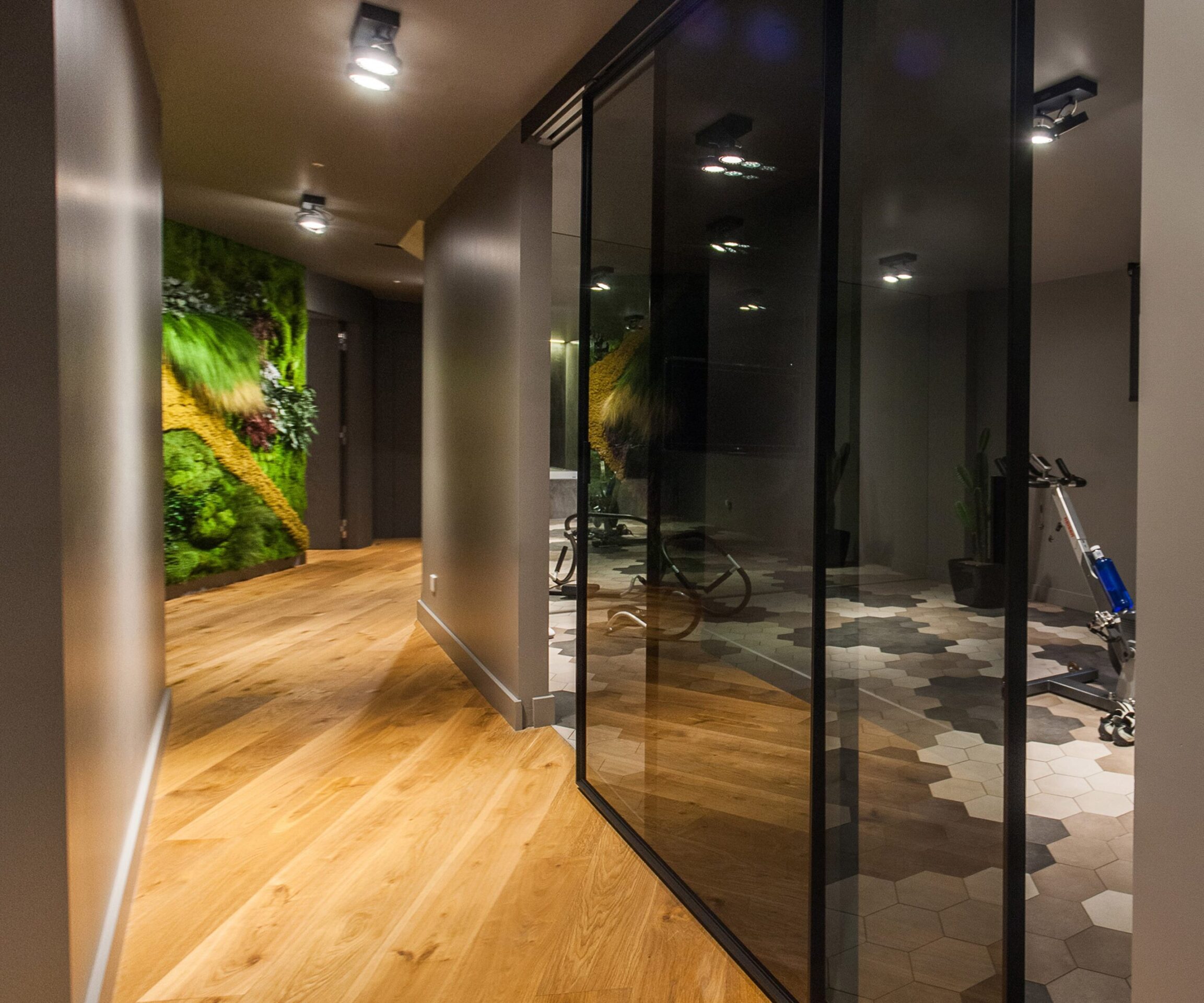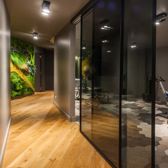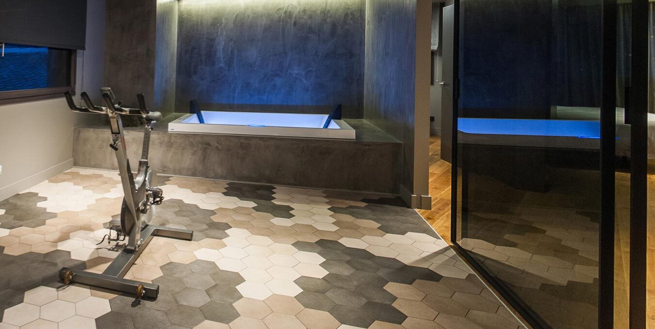 The lower floor houses the most intimate spaces, and especially those dedicated to bodily care and relaxation. A gym and a spa occupy many square metres of floor space, finished with a dynamic combination of wood and stoneware, styled very specifically for the area's intended use.