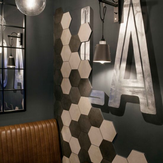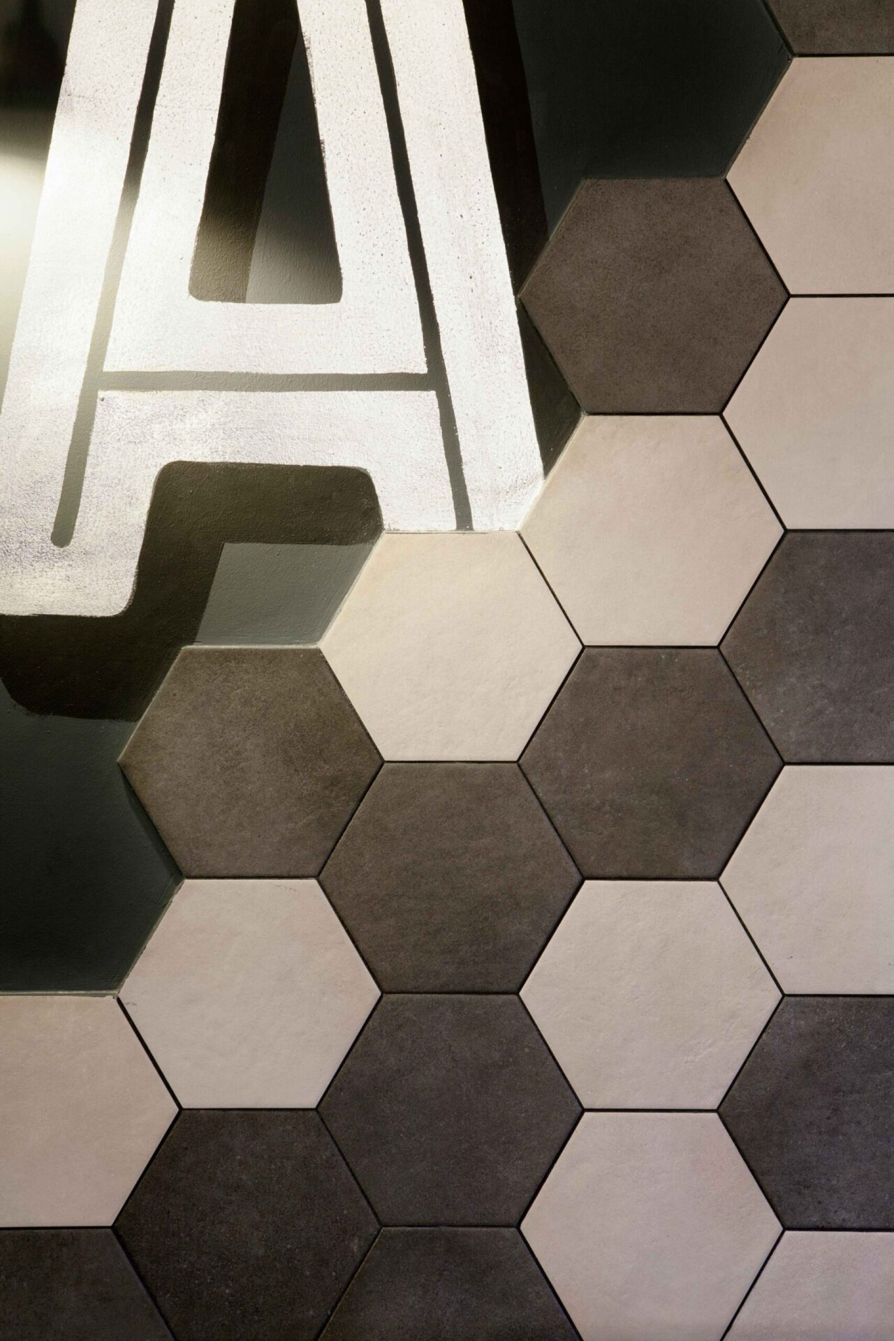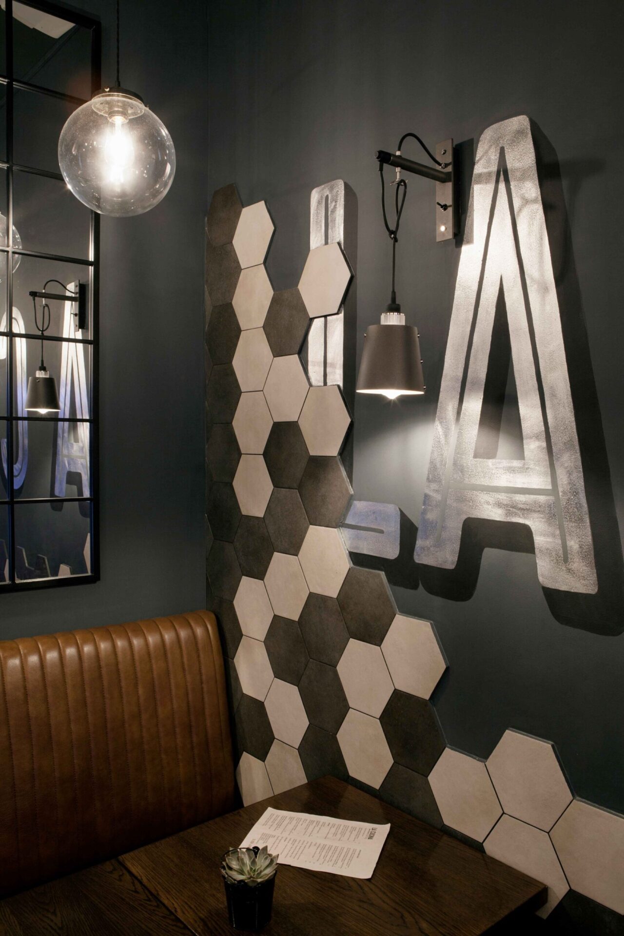 To complete the look, the wall tiles use overlapping effects: the hexagons appear in part to conceal slogans and messages written in chalk on slate, referencing the logo on the restaurant's large front window.