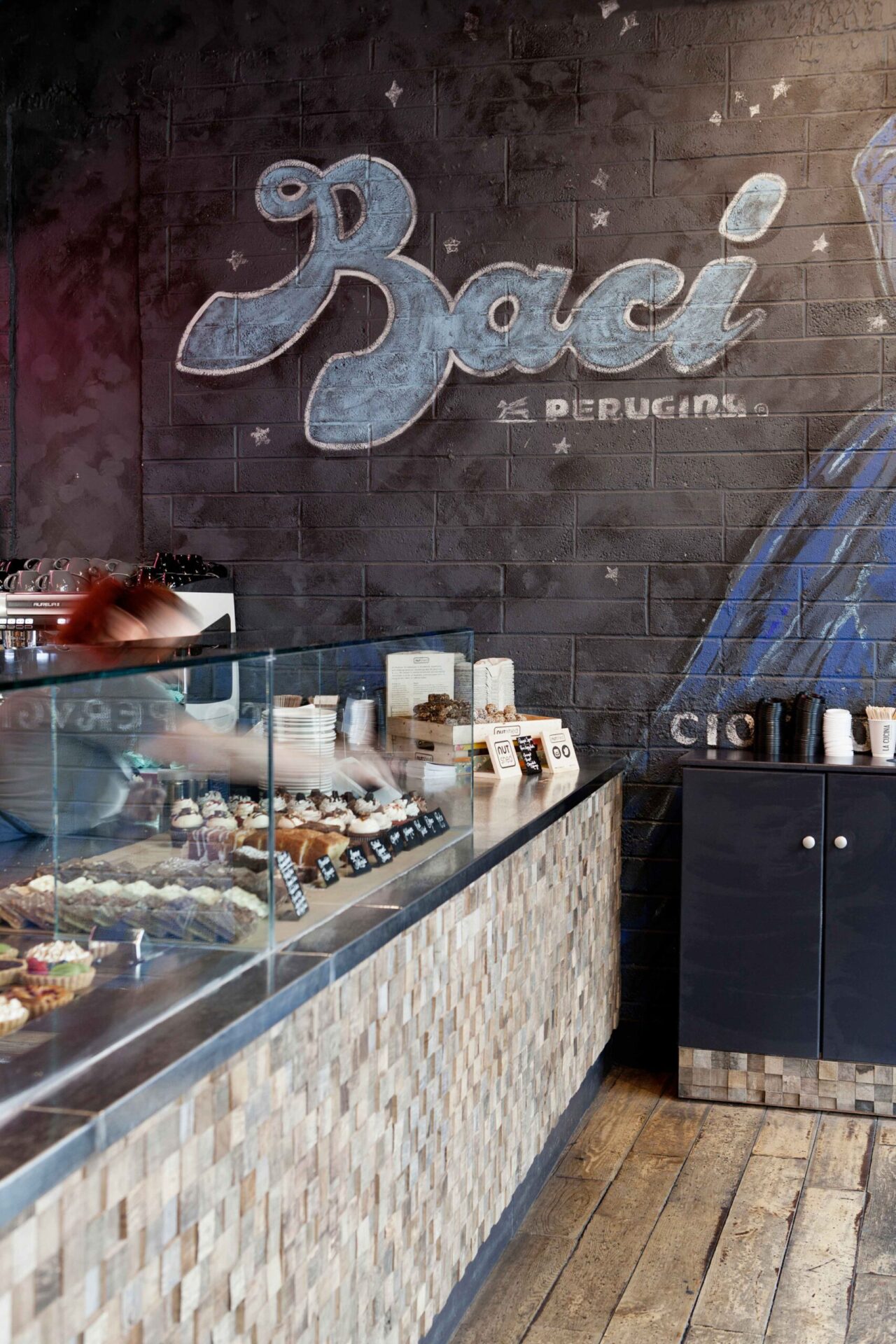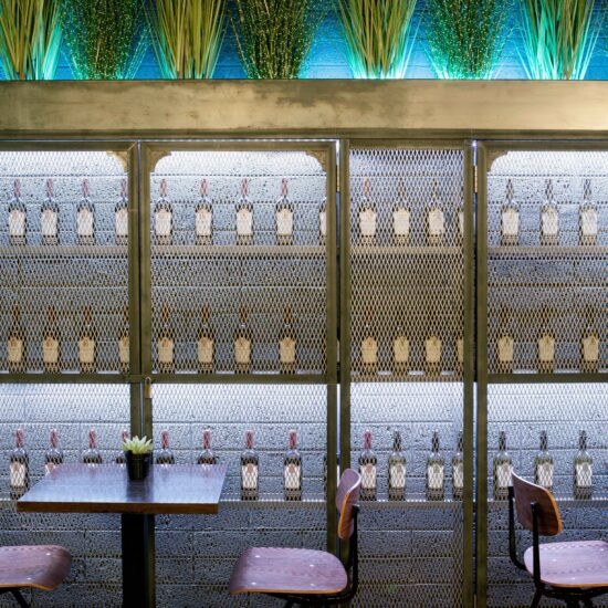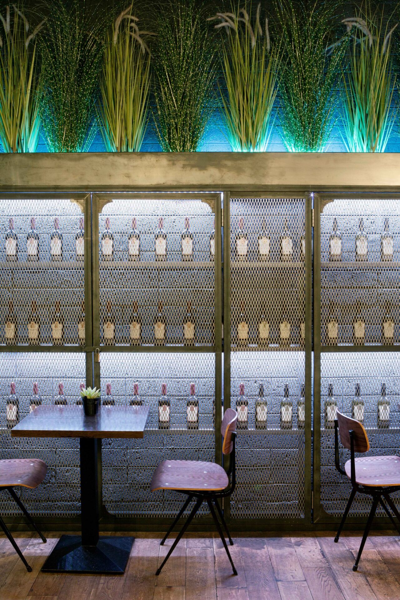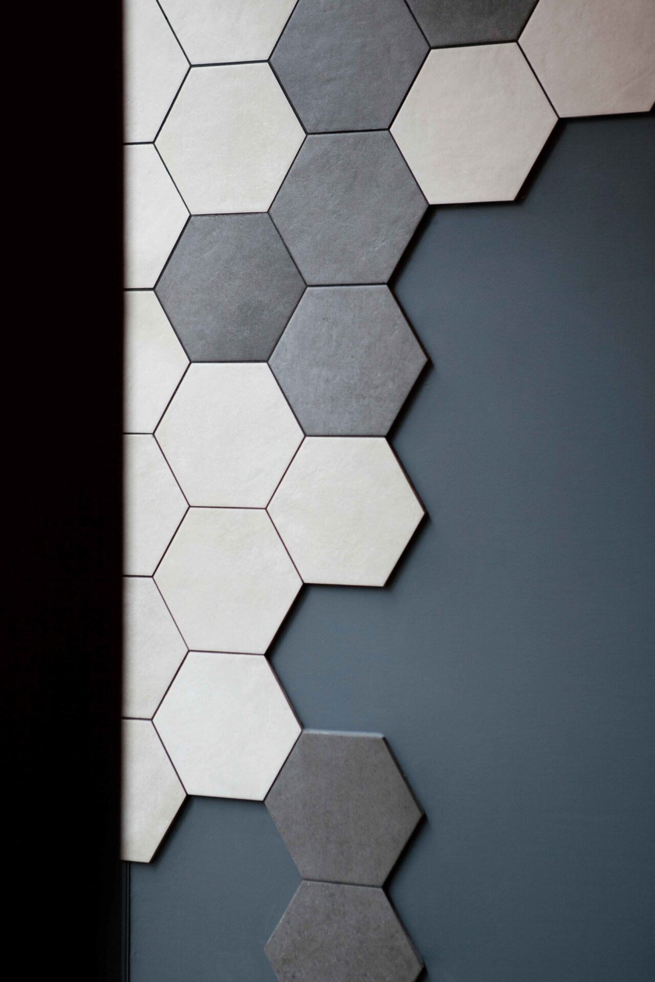 To complete the look, the wall tiles use overlapping effects: the hexagons appear in part to conceal slogans and messages written in chalk on slate, referencing the logo on the restaurant's large front window.