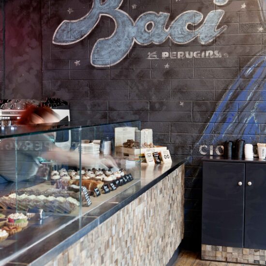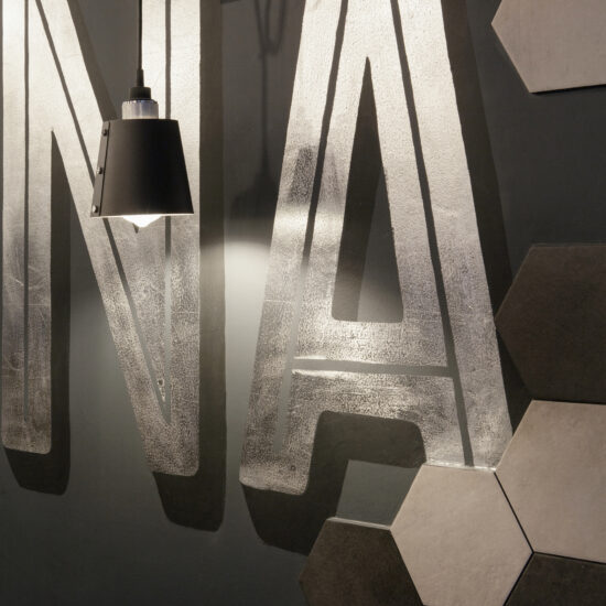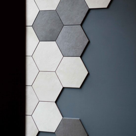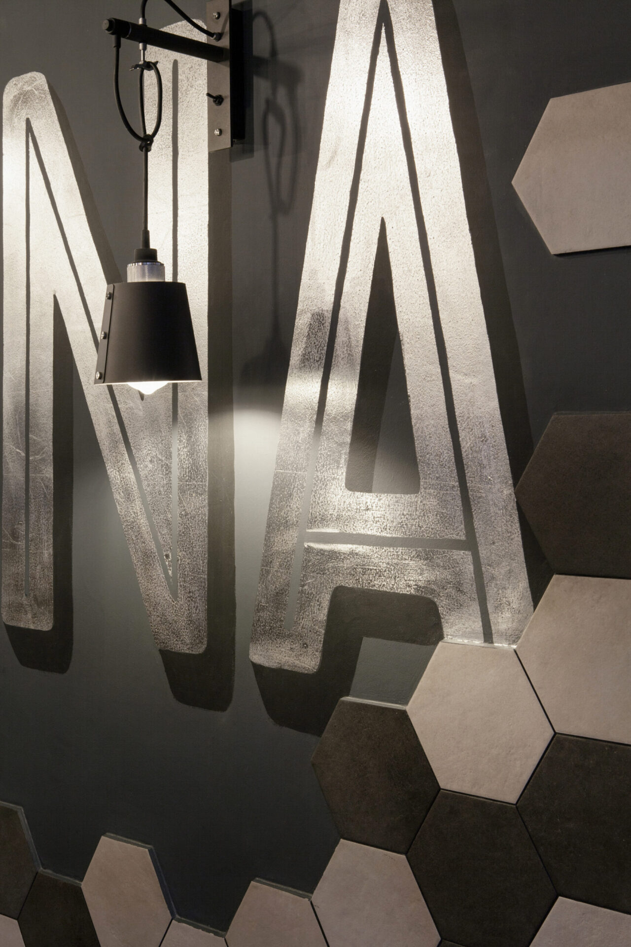 First and foremost, the decision by the interior designer Tullio Orlandi to conserve the outer shell and to reference it stylistically inside the restaurant by means of finishes and colours: dark shades in the scale of greys, black&white contrasts, chalk on slate effect, bare stone and apparently unfinished coverings, creating the impression of an interior that has evolved over time, achieved using the hexagon tiles from the Ragno Rewind collection.