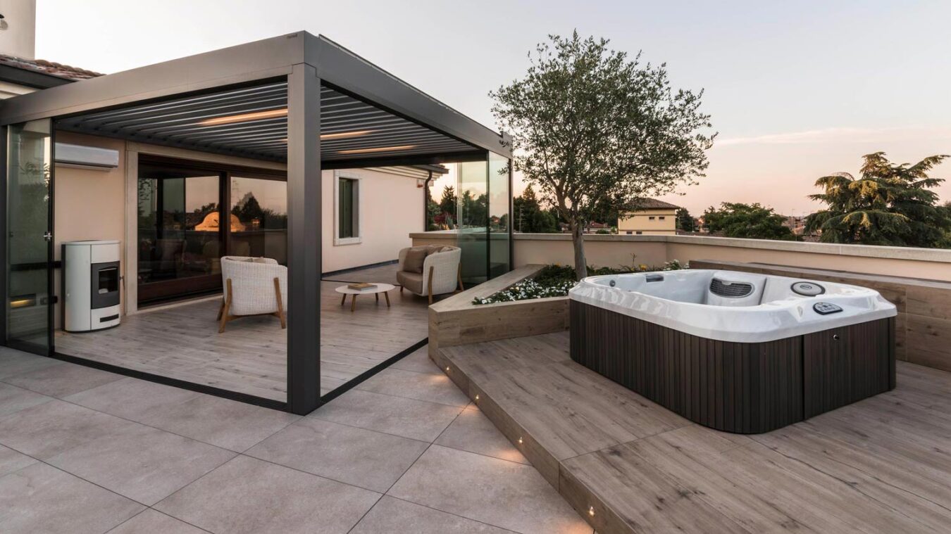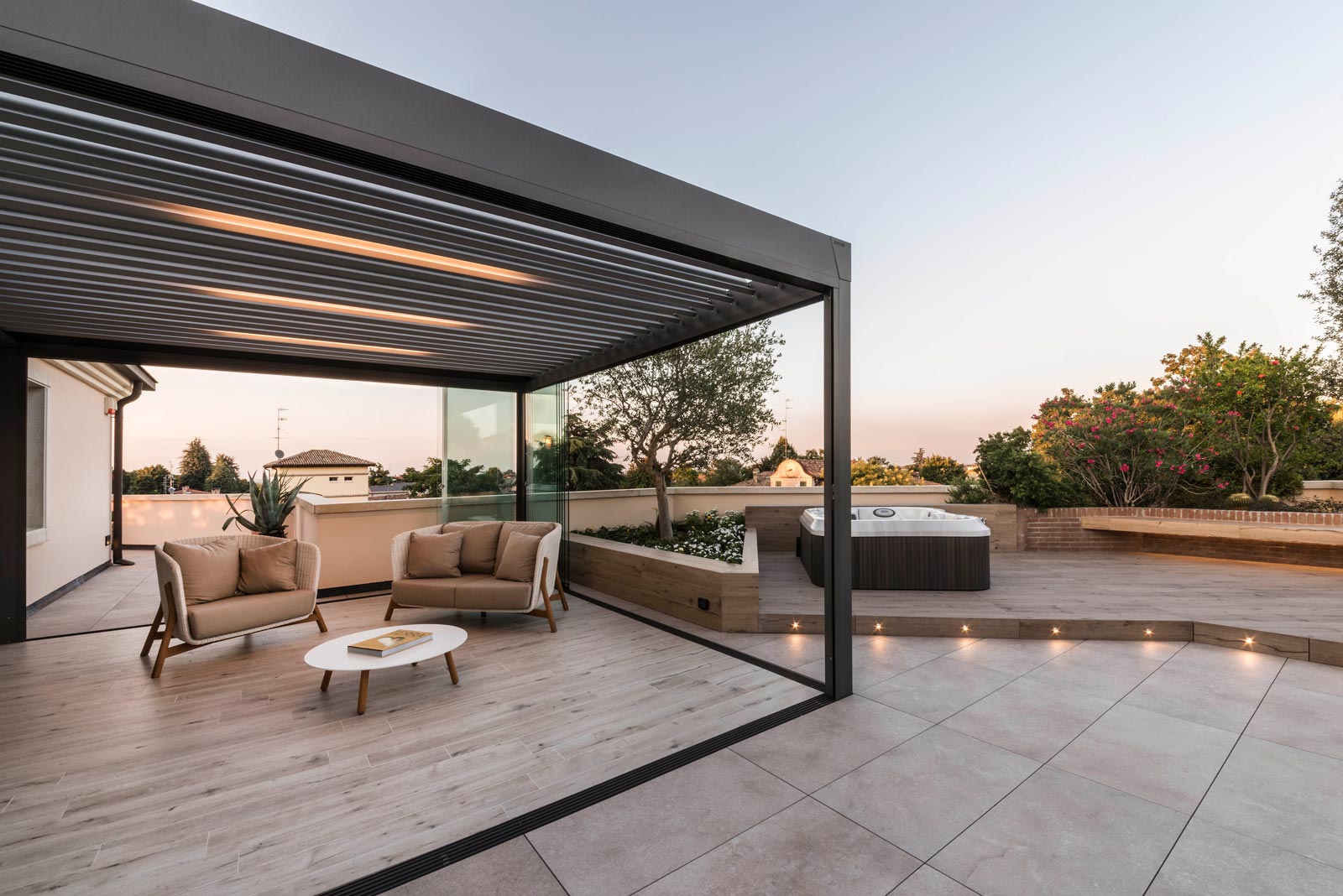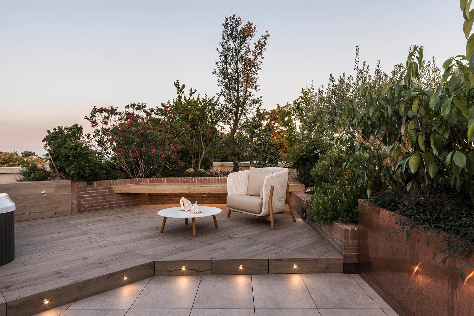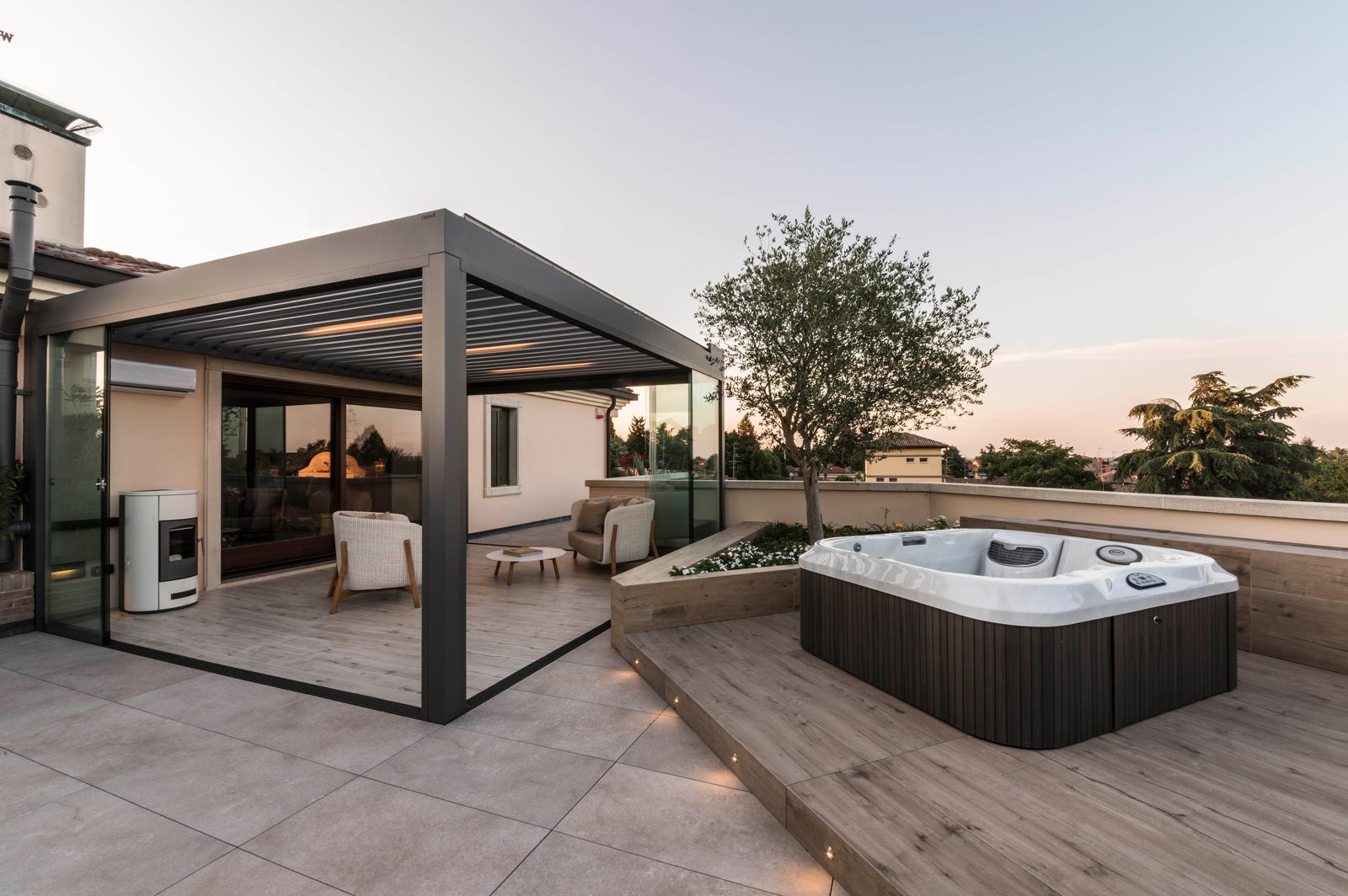A hydromassage tub partially sunk into the floor in a slightly raised part of the terrace, a hearth and a more open, sociable living area are picked out by the difference between their finishing material and that of the paths.