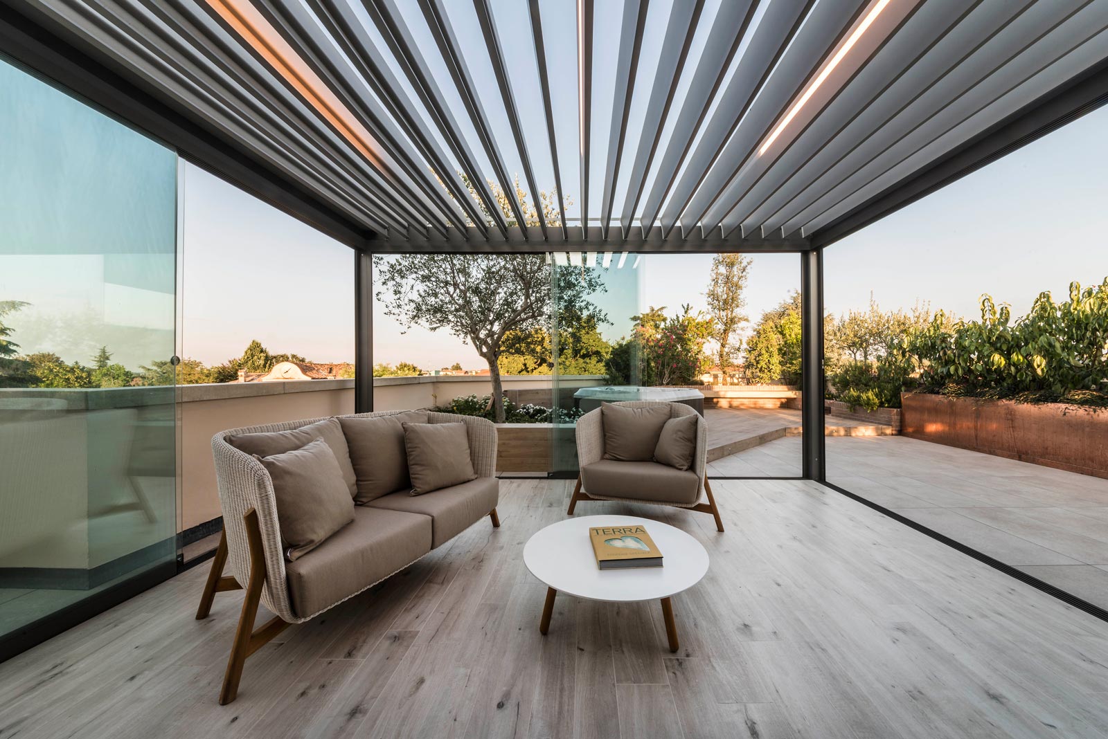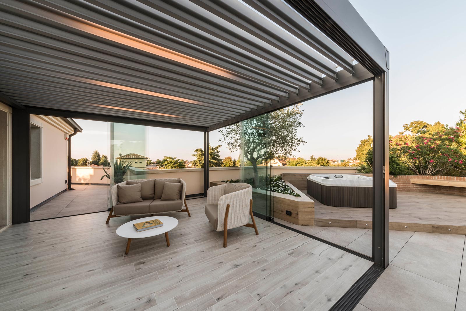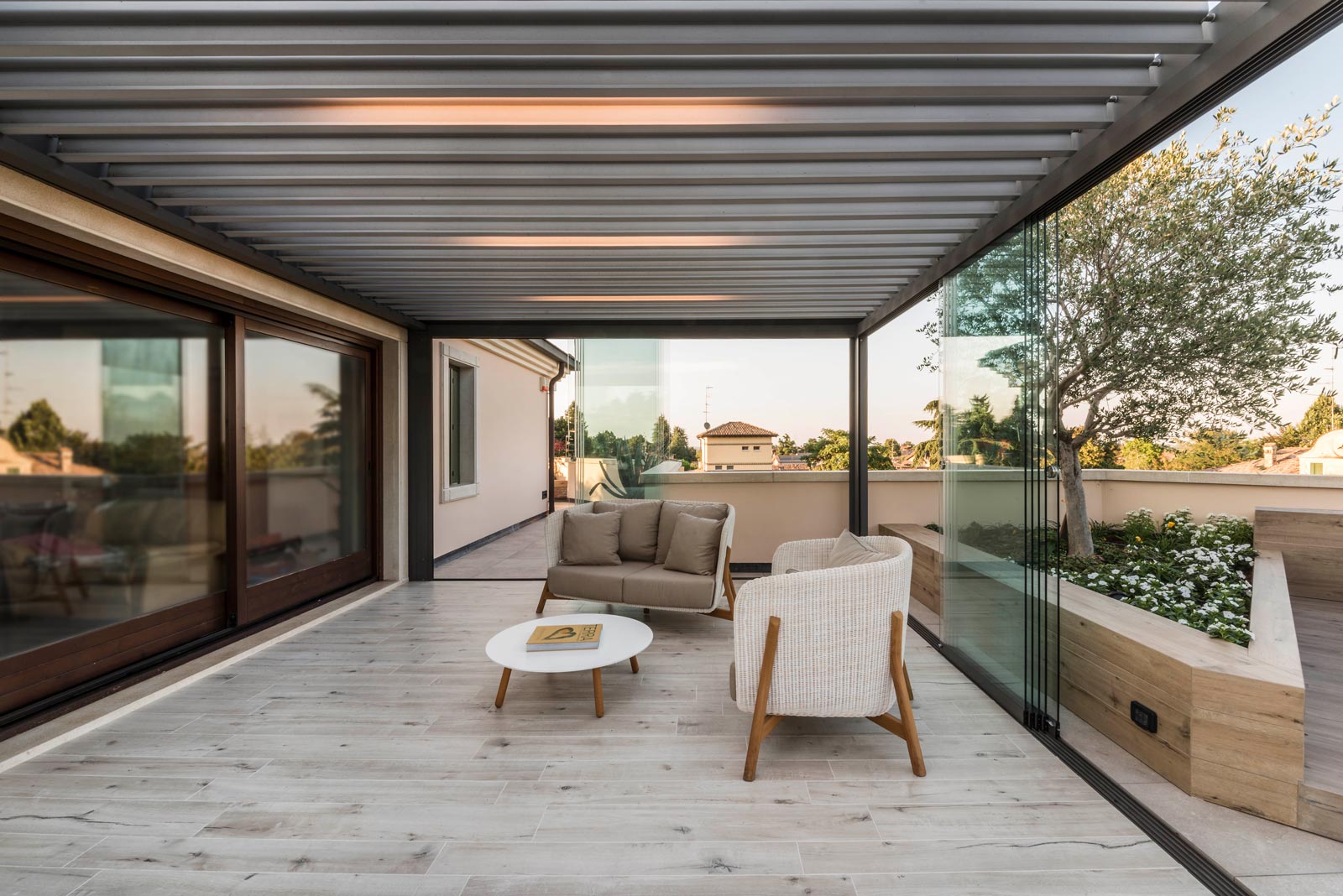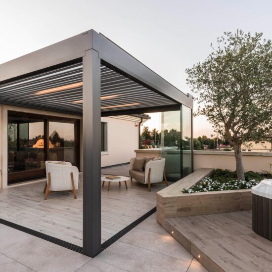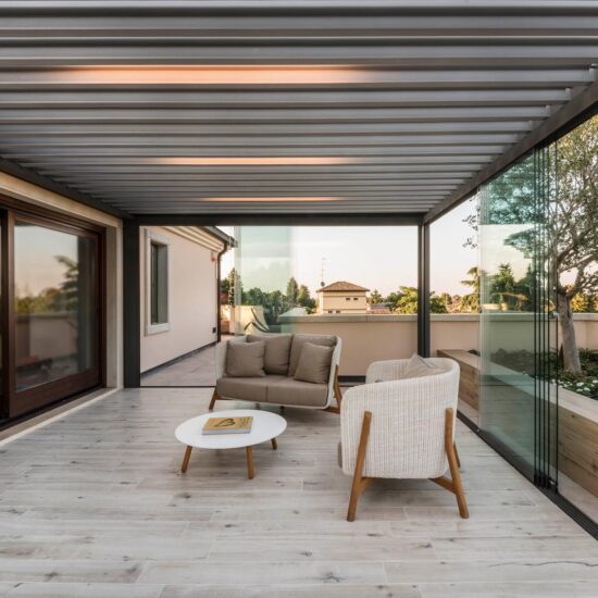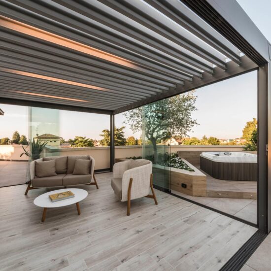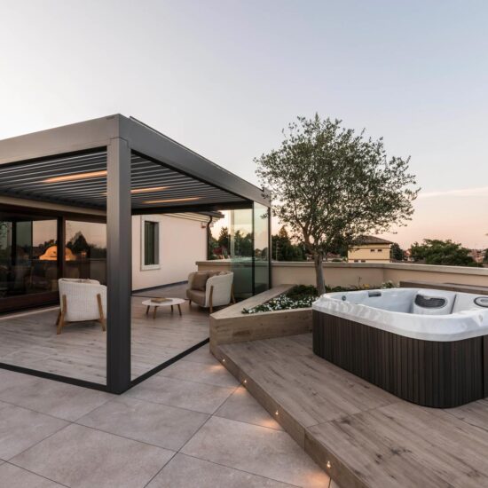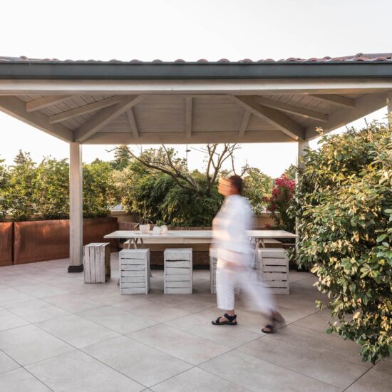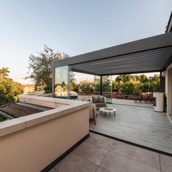 The focus is all on the large terrace which, thanks to skilful, tasteful renovation, has been reborn after years of neglect which had resulted in the deterioration of its surfaces, architectural features and fixtures. The project comprises two main areas, separated by the important functional division created by the bioclimatic pergola, a genuine outdoor extension of the living space.