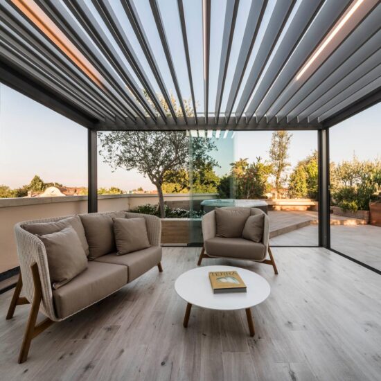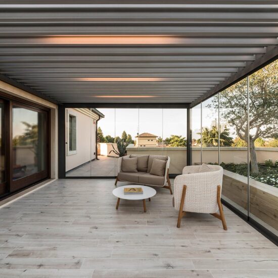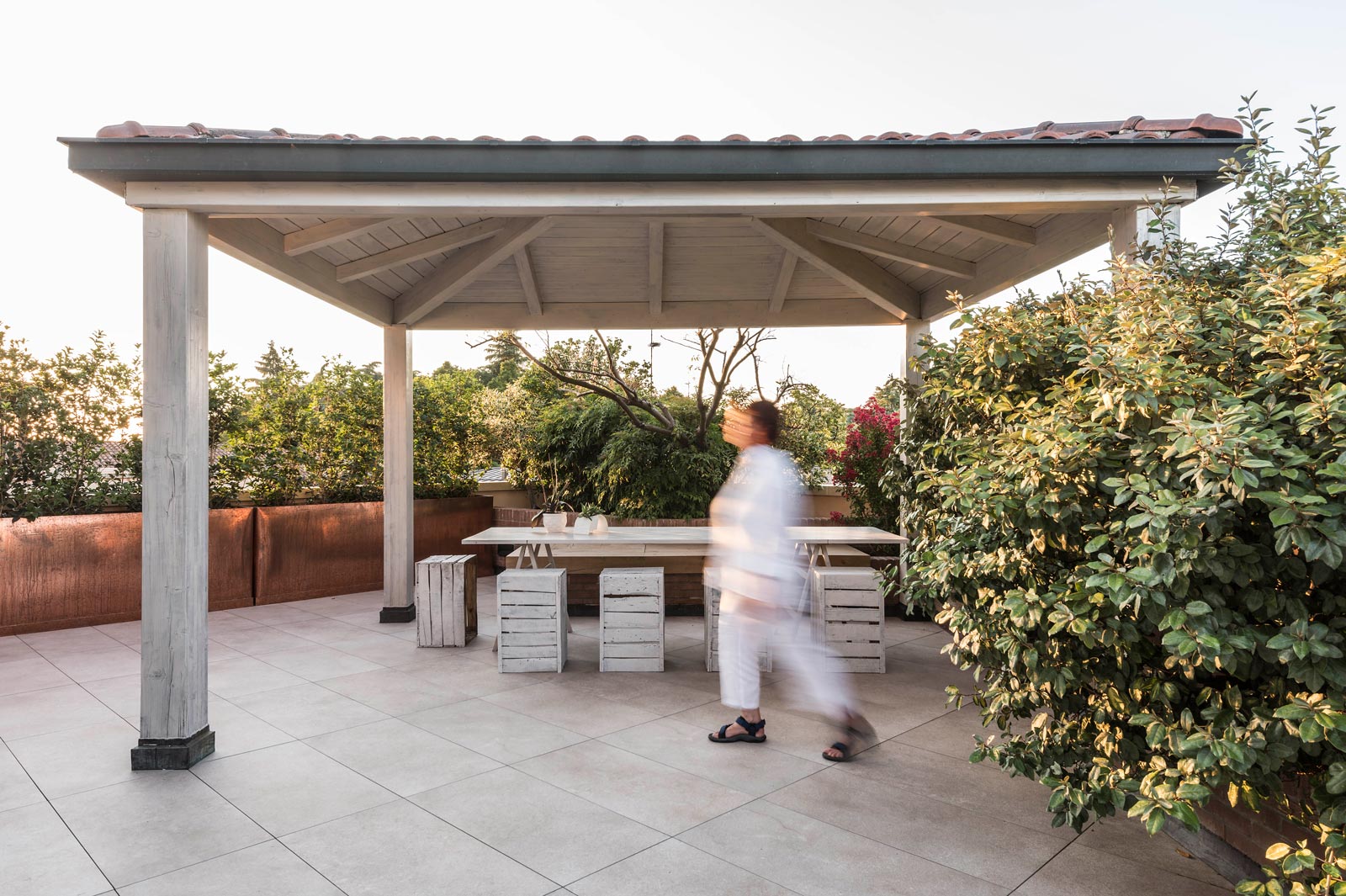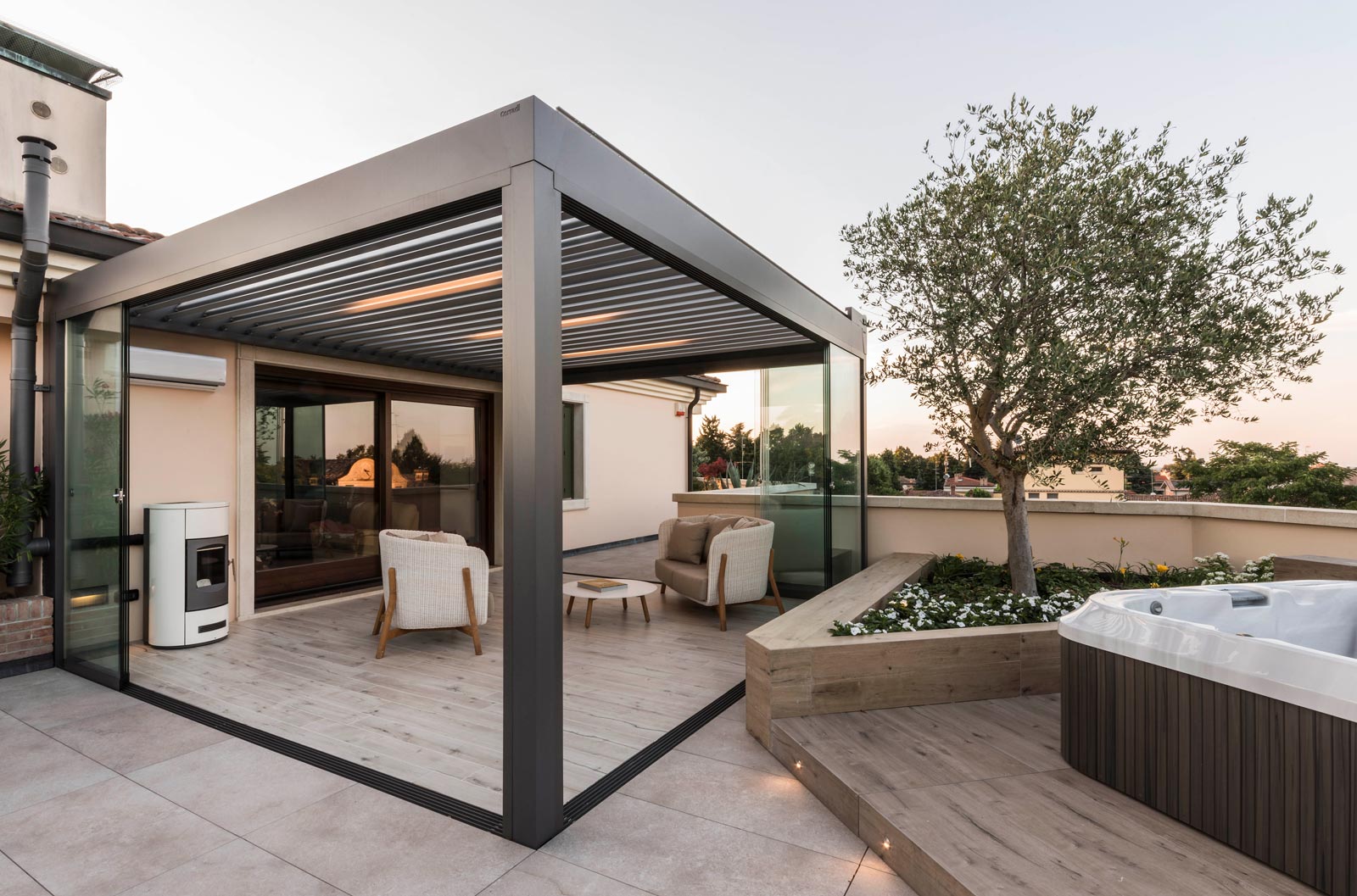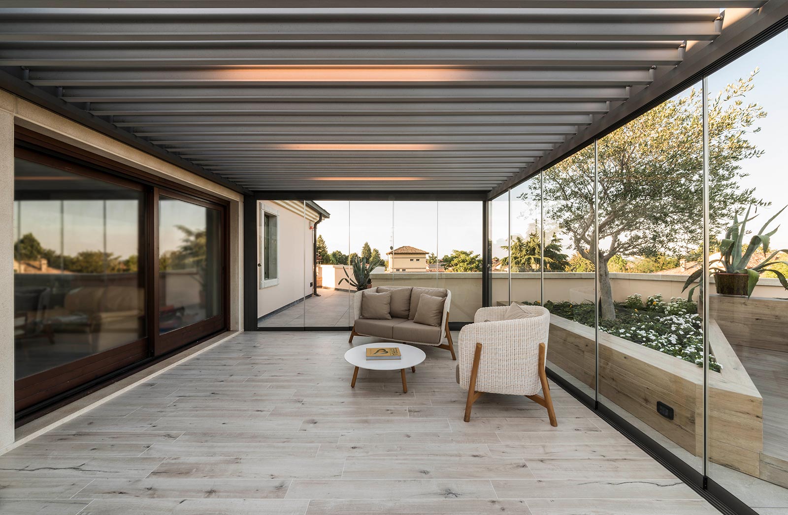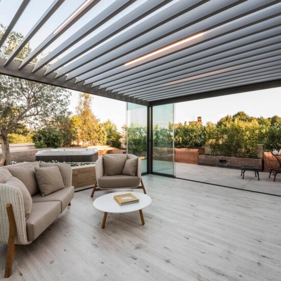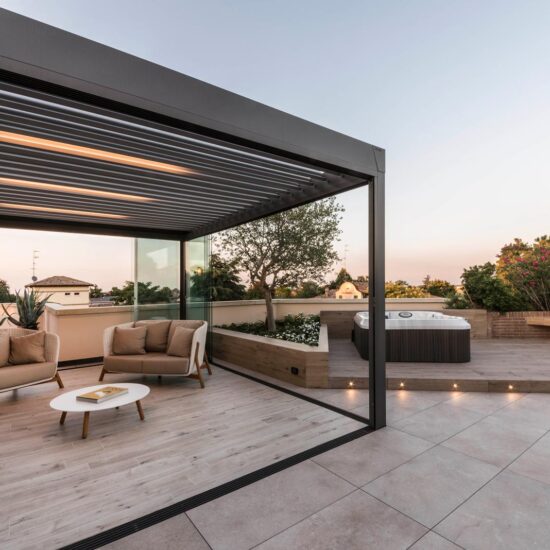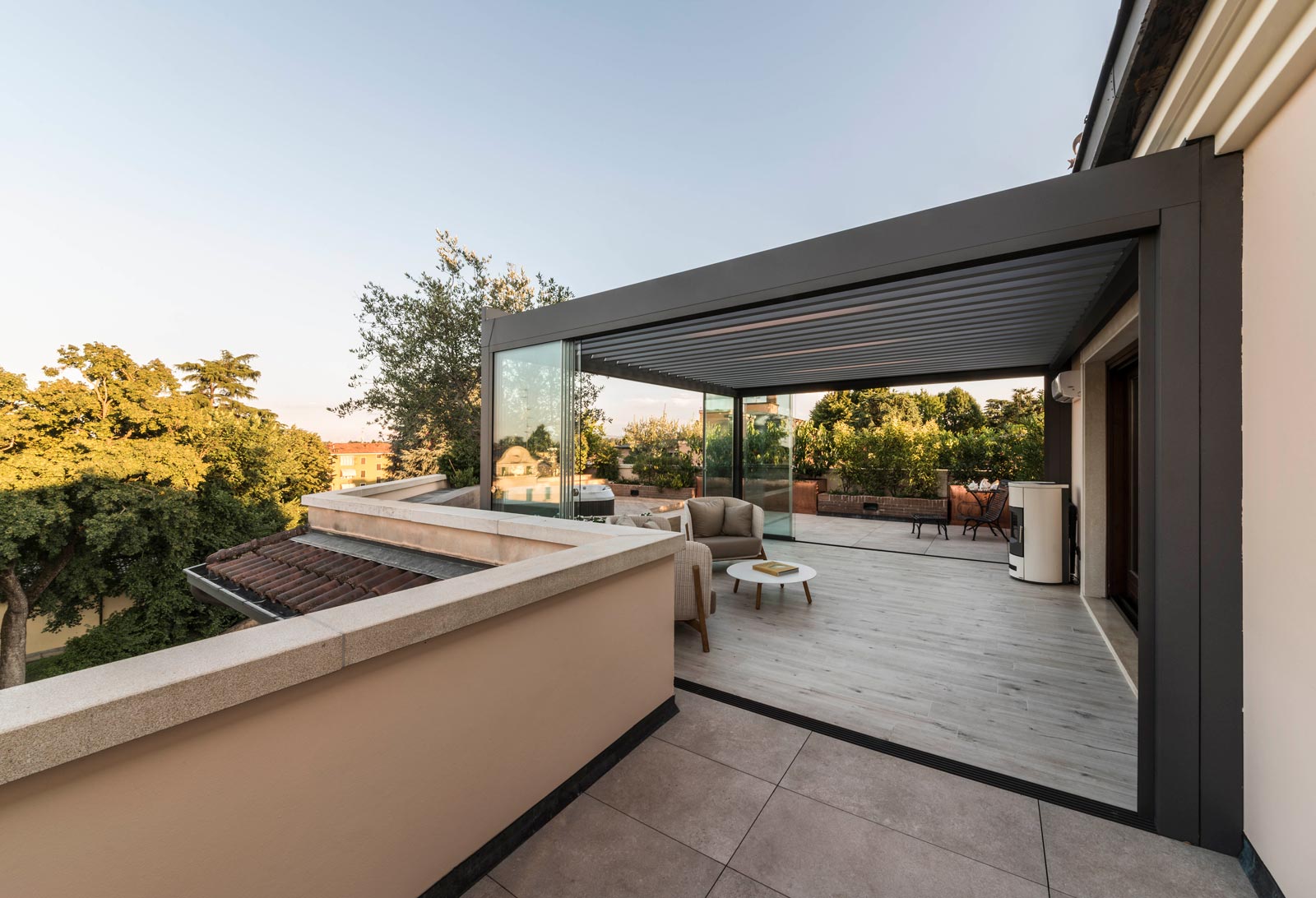 The focus is all on the large terrace which, thanks to skilful, tasteful renovation, has been reborn after years of neglect which had resulted in the deterioration of its surfaces, architectural features and fixtures. The project comprises two main areas, separated by the important functional division created by the bioclimatic pergola, a genuine outdoor extension of the living space.