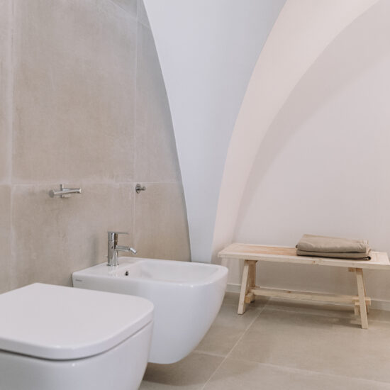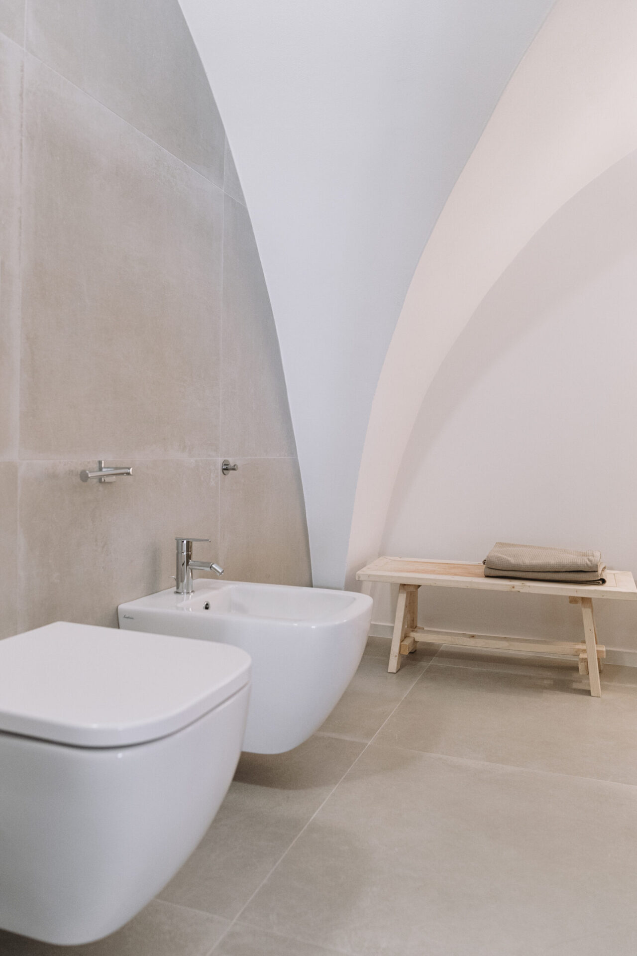 In one of the bathrooms, velvety, luminous delicacy is expressed in the choice of Patina porcelain stoneware, a Ragno product that will please both those who enjoy the uniform look of resin and those who also like to see the traces of time and everyday gestures, repeated for generations, on the stoneware surface.