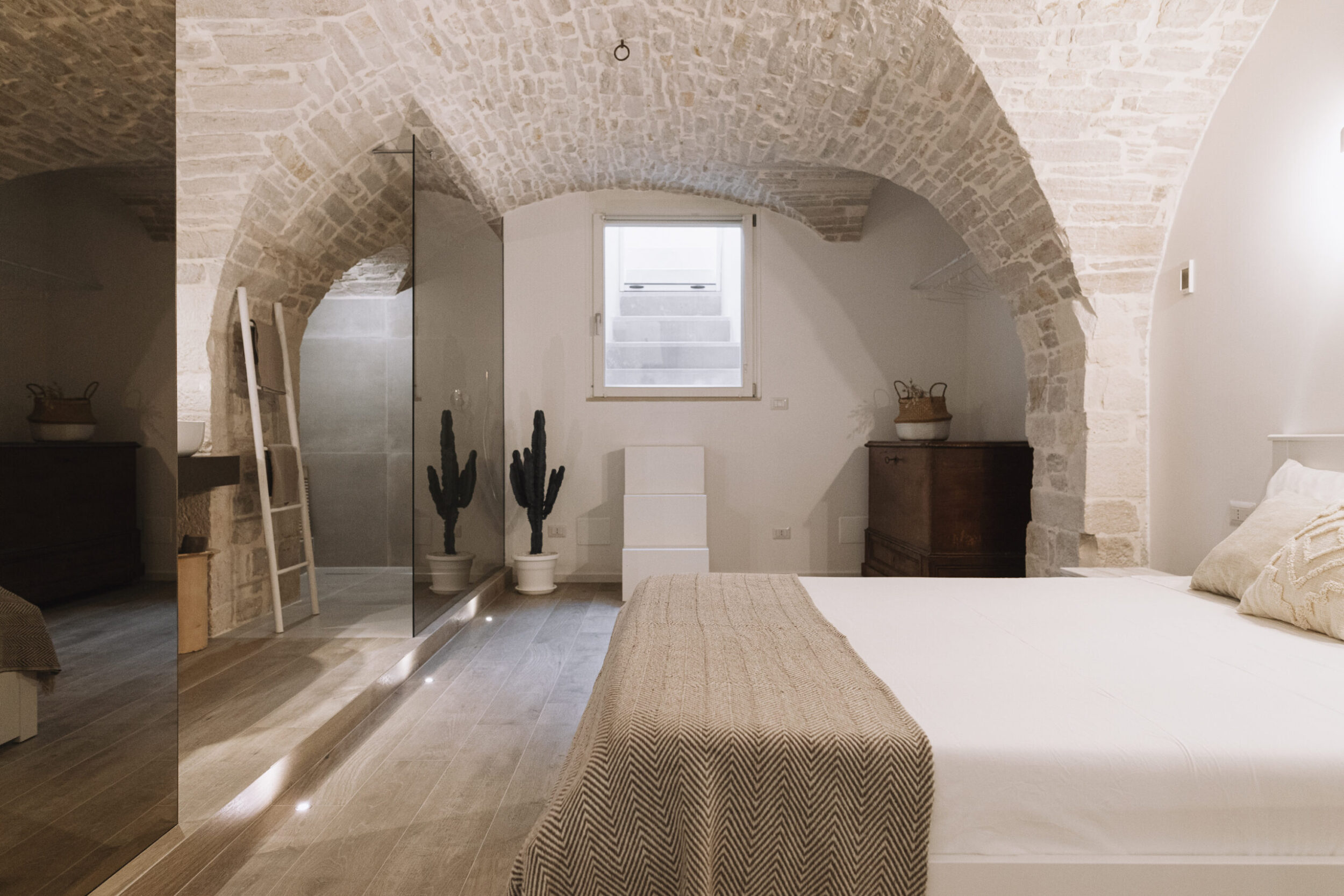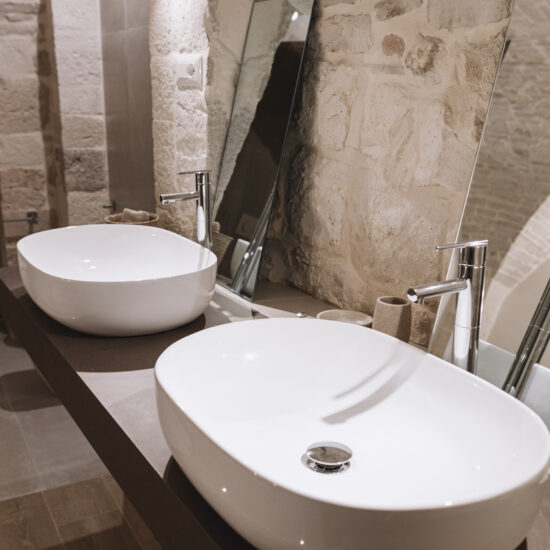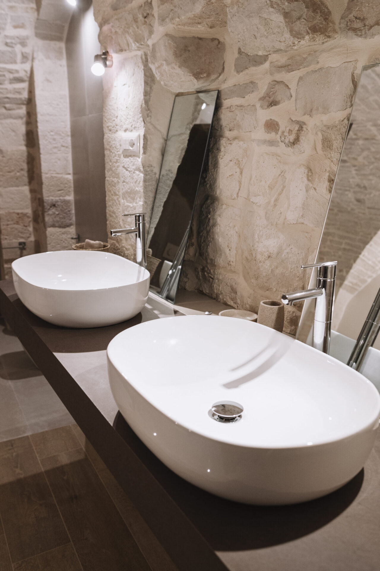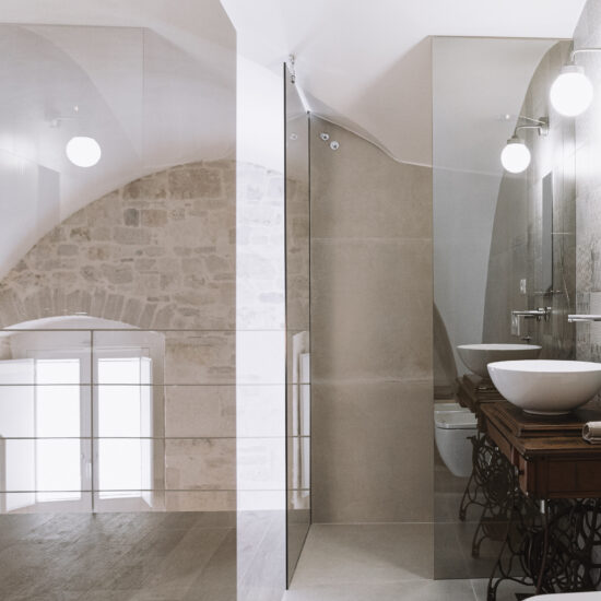 The basic material is the local stone, which forms an ancient, solid shell to protect the whole. Inside, however, there is something unexpected, warm and welcoming. The new layout of the rooms, multiplied by reflecting glass and mirrors, creates modern, luminous interiors, ideal for passing entire days relaxing and taking one’s time.