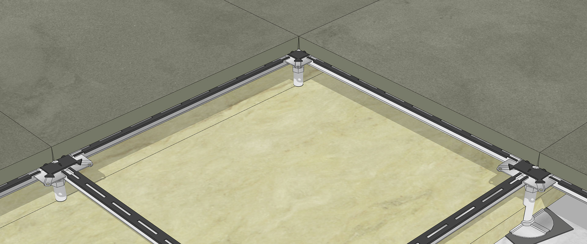 The raised floor panels are sustained by a supporting structure that allows them to be raised above the building base and facilitates levelling. The vertical and horizontal components are made of galvanised steel to prevent corrosion.